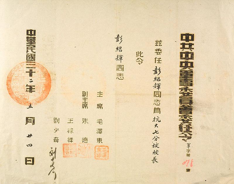抗日戰(zhàn)爭時期中共中央軍委任命彭紹輝為抗大七分校校長的委任令(資料圖)