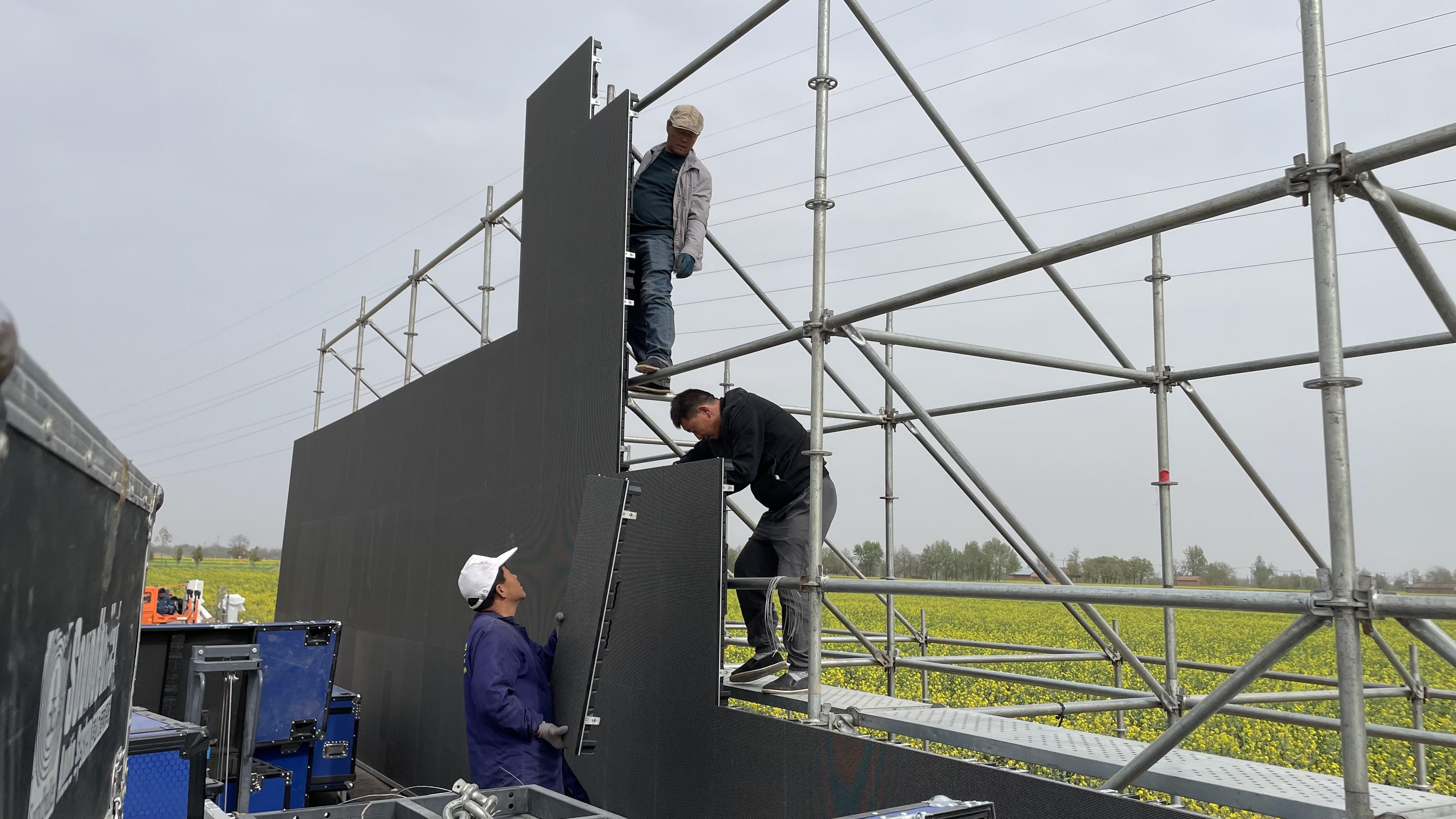 走進(jìn)現(xiàn)場(chǎng),彩旗飄飄,成片的油菜花在風(fēng)中搖曳,工人們正在搭建舞臺(tái)框架,他們站在腳手架上,認(rèn)真測(cè)量,精準(zhǔn)定位,將一塊塊LED顯示板精準(zhǔn)地拼接在一起。另一邊,電力工人正在正仔細(xì)檢查供電線路和設(shè)備的調(diào)試,確保比賽期間電力供應(yīng)的穩(wěn)定性和安全性。