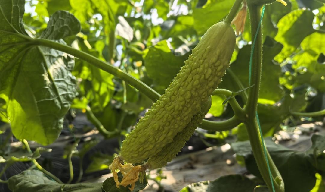 孔橋村村民賈喜粉是當?shù)氐姆N植大戶,今年她承包了8個拱棚、5個設施大棚種植蔬菜和瓜果?,F(xiàn)在,草莓采摘已接近尾聲,白黃瓜接茬上市。綠葉掩映下,“白胖胖”的黃瓜掛滿藤蔓,長勢十分喜人。