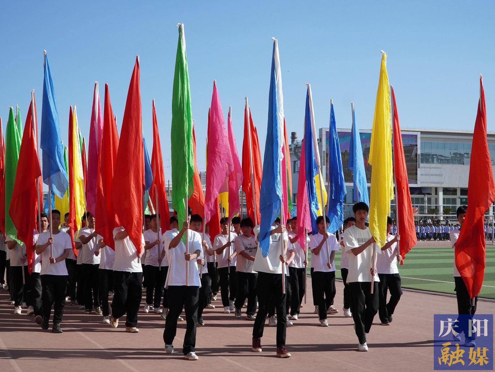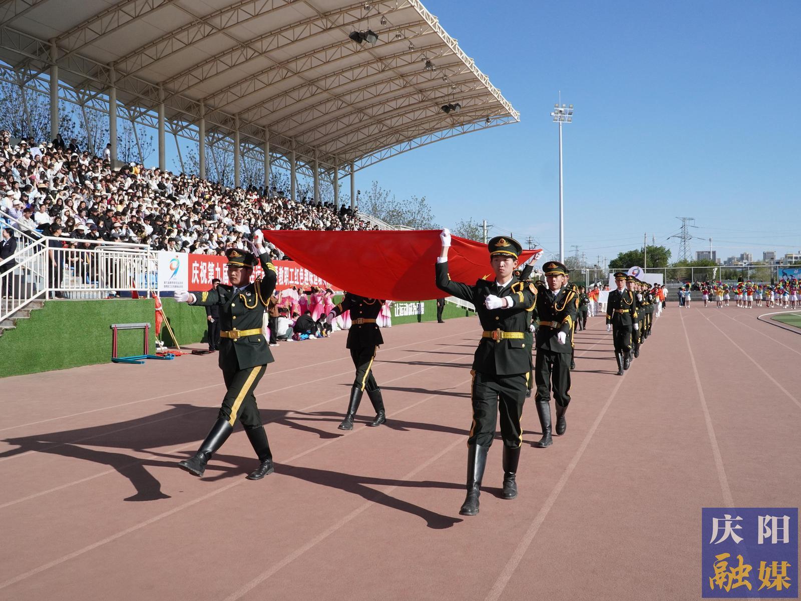 伴隨著鏗鏘的樂曲,國旗護衛(wèi)隊高擎五星紅旗率先入場,他們步伐整齊、目光堅毅,紅色旗幟上的五顆金星輝映著新時代青年的使命擔當。這支成立于2015年的隊伍,十年如一日踐行“護衛(wèi)國旗、報效祖國”的誓言,成為運動會上最莊嚴的風景。緊隨其后的是校旗、會徽方陣,慶陽職業(yè)技術學院?;罩型信e朝陽的雙手與翻開的書頁,象征著知識與理想的交融,會徽上躍動的數(shù)字“9”與三色環(huán),則彰顯著第九屆運動會的團結(jié)拼搏與激情澎湃。