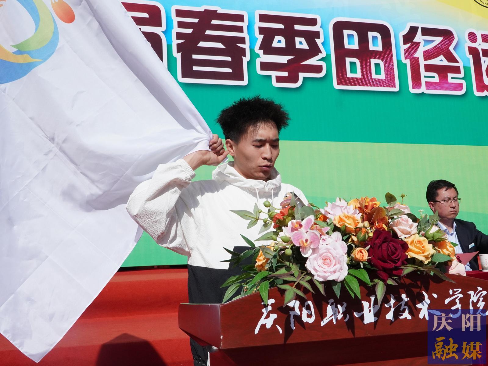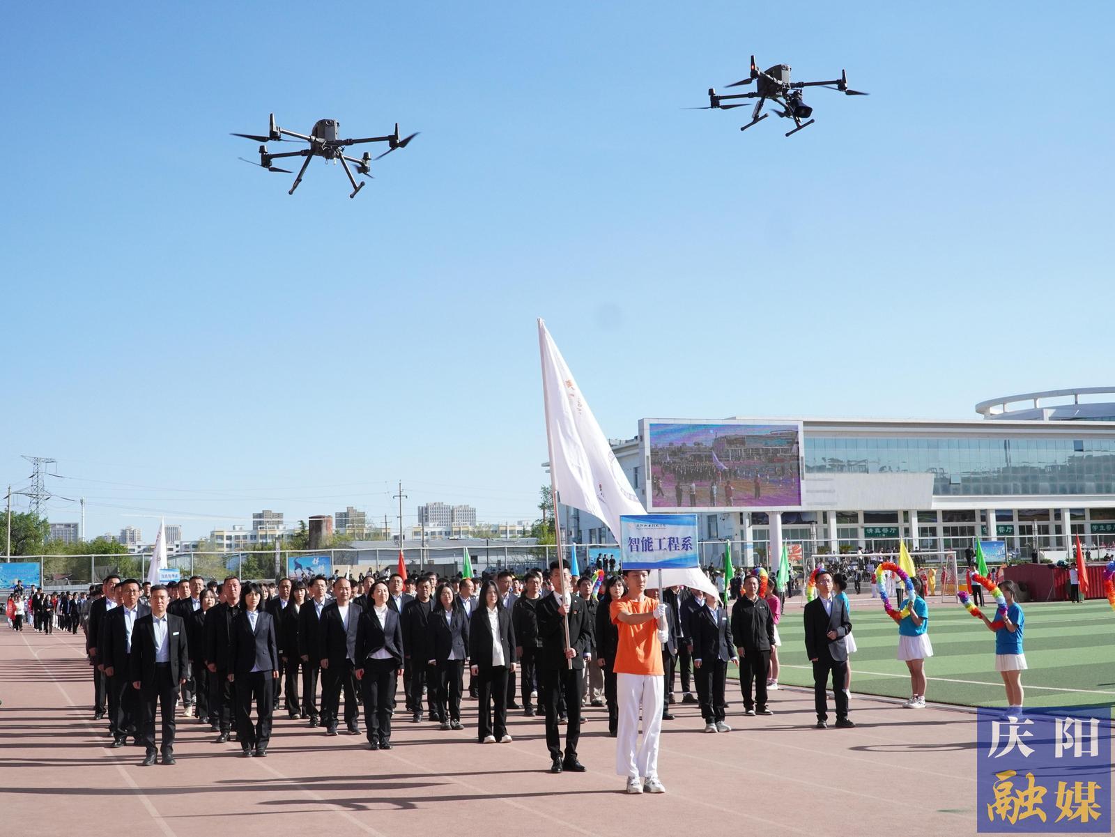 花束隊手捧繽紛花環(huán),如虹彩點亮賽場;彩旗隊揮舞64面旗幟,似流云涌動青春。裁判員方陣步履堅定,以專業(yè)與公正為賽事護航;馬克思主義學院教師高舉立德樹人大旗,步履間盡顯鑄魂育人的赤誠;智能工程系師生攜無人機列陣,科技與創(chuàng)新之光照耀賽場;文化旅游系攜農(nóng)文旅融合藍圖,能源化工系高呼“我為祖國獻石油”,技師學院舞動籃球炫技,教育系賡續(xù)師道匠心……13支方陣各展風采,將專業(yè)特色與奮斗理想融入鏗鏘步伐,匯成慶陽技術學院高質(zhì)量發(fā)展的生動剪影。