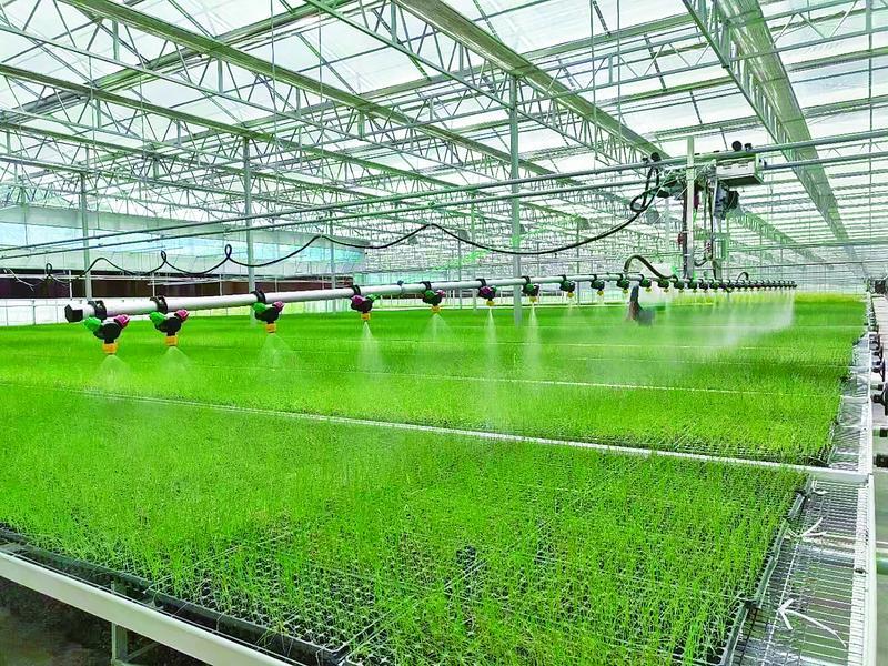 甘肅聚廣利農(nóng)業(yè)科技有限公司位于新集鎮(zhèn)的千畝現(xiàn)代設(shè)施蔬菜基地大棚內(nèi),自動(dòng)化設(shè)備正在給蔬菜苗木噴灑澆灌