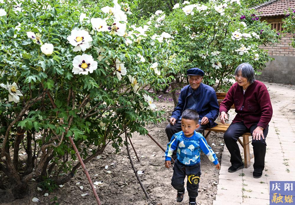 翟相儒和老伴在自家60年花齡的“牡丹王”下看著重孫玩耍。