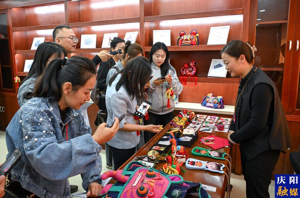 第二十屆慶陽(yáng)香包民俗文化節(jié)新聞發(fā)布會(huì)現(xiàn)場(chǎng),參會(huì)記者拍攝慶陽(yáng)香包。
