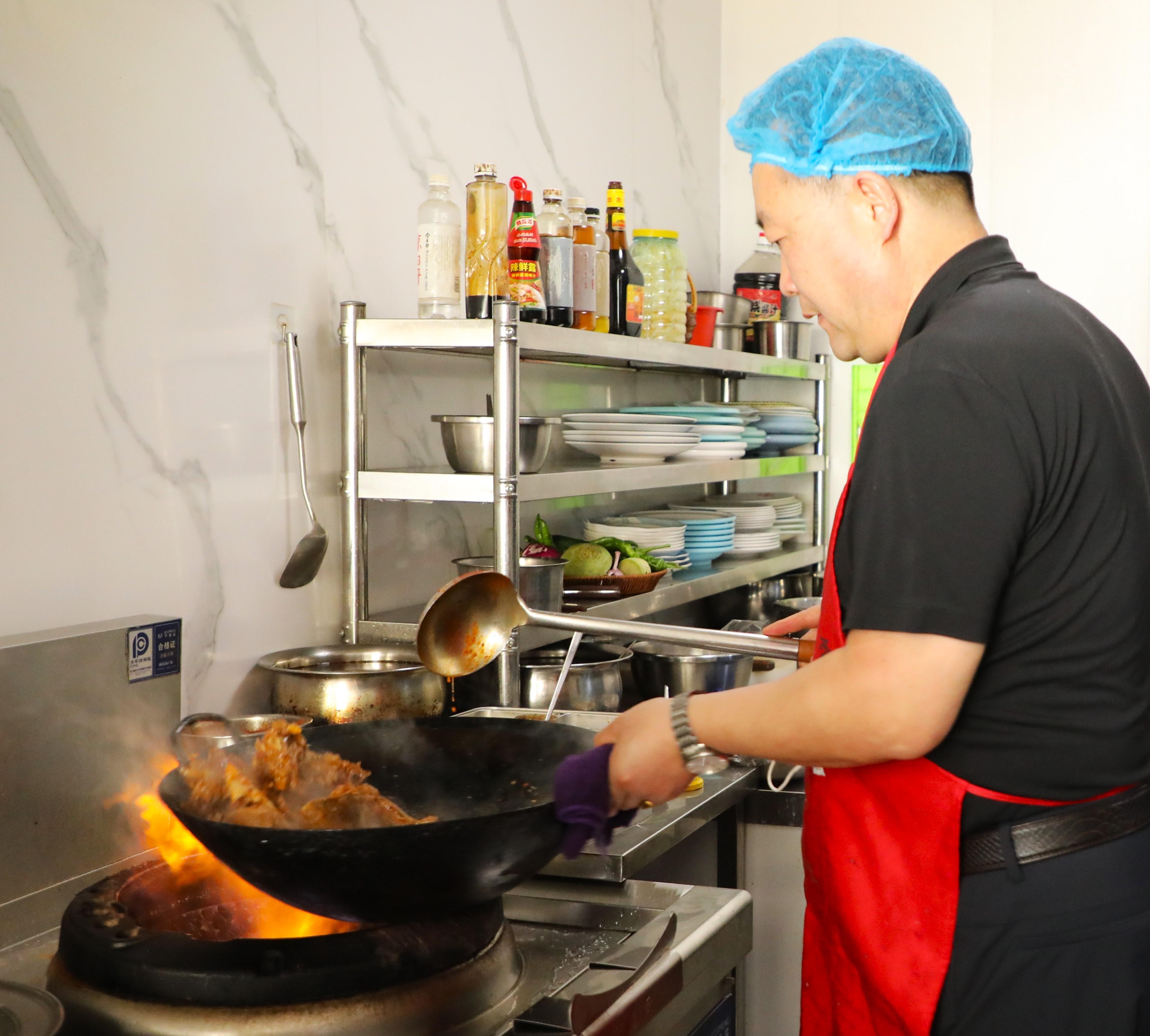 廚房角落,45歲的劉懷龍正專注地調(diào)控火候,挽起的袖口下,黝黑的手臂格外顯眼。誰能想到,這位生意紅火的老板,曾是社會上一名很不起眼的打工仔。