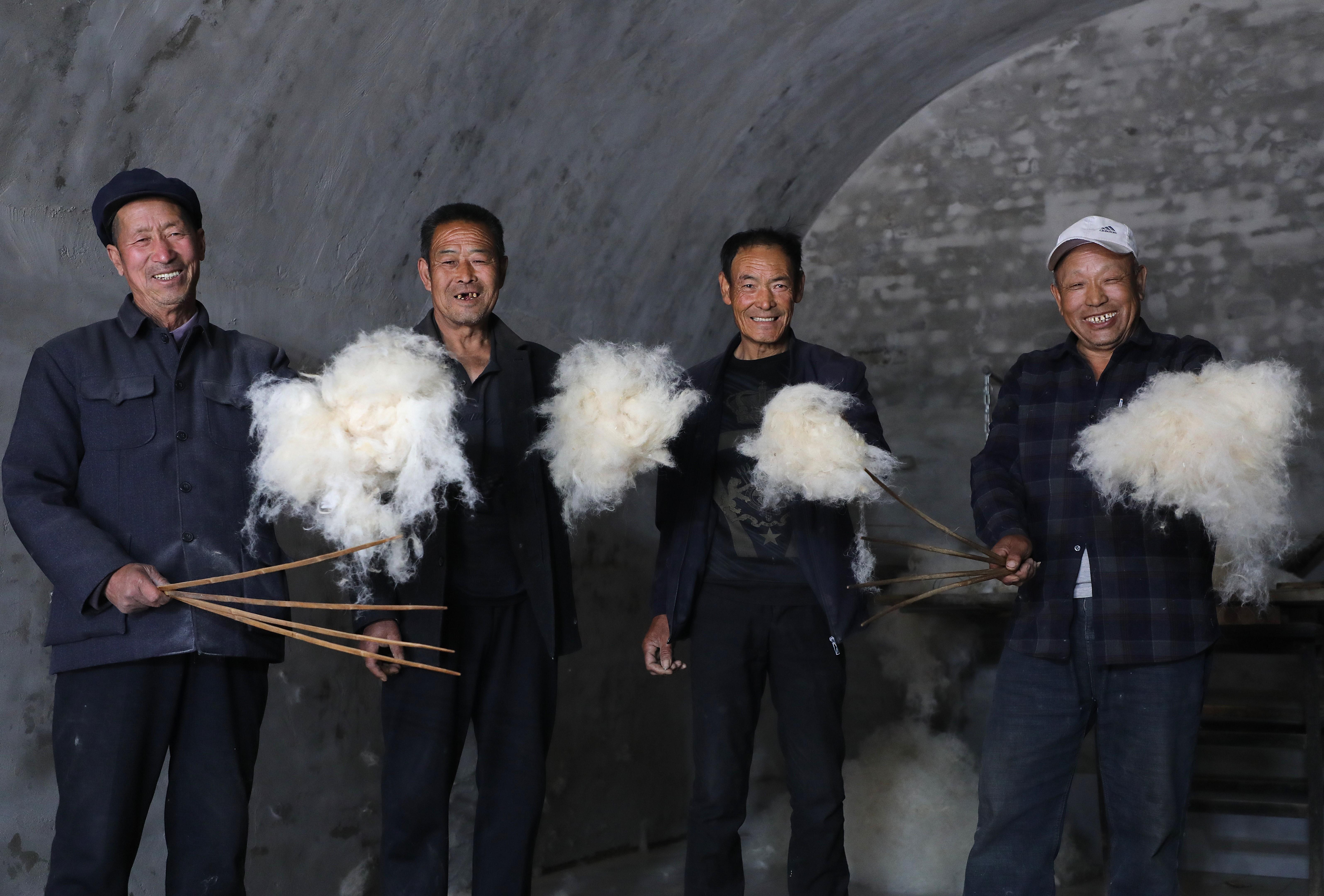 近日,應(yīng)環(huán)縣洪德鎮(zhèn)耿塬畔莊子峁負(fù)責(zé)人楊清艷邀請,薛占省帶領(lǐng)兩位堂弟徒弟—63歲的薛占紅和59歲的薛占義,以及本村另一位王姓老氈匠,重新拿起塵封已久的簾、弓、撣、絆、叉等簡單工具,來到莊子峁,再次展示這門古老的技藝。
