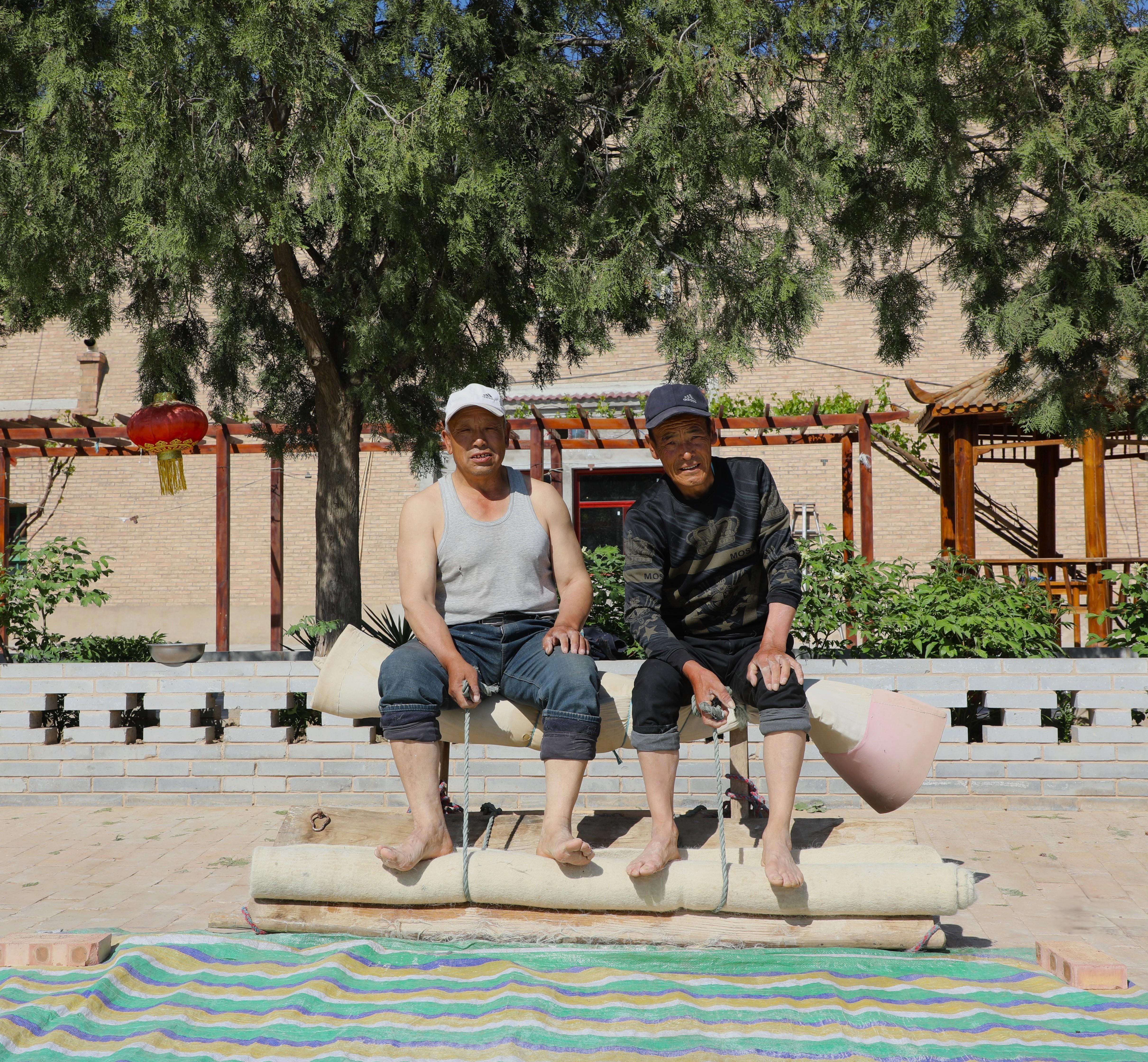 第十道洗氈,這是毛氈制作的關(guān)鍵收尾工序。院子里,兩位匠人光腳并排坐在木凳上,神情專注。他們把兩根繩子一端系在木凳上,一端抓在手里,將氈卷系在繩上,邊往氈卷澆開水,邊用腳反復(fù)踩揉、滾動(dòng),直到毛氈變得瓷實(shí)。