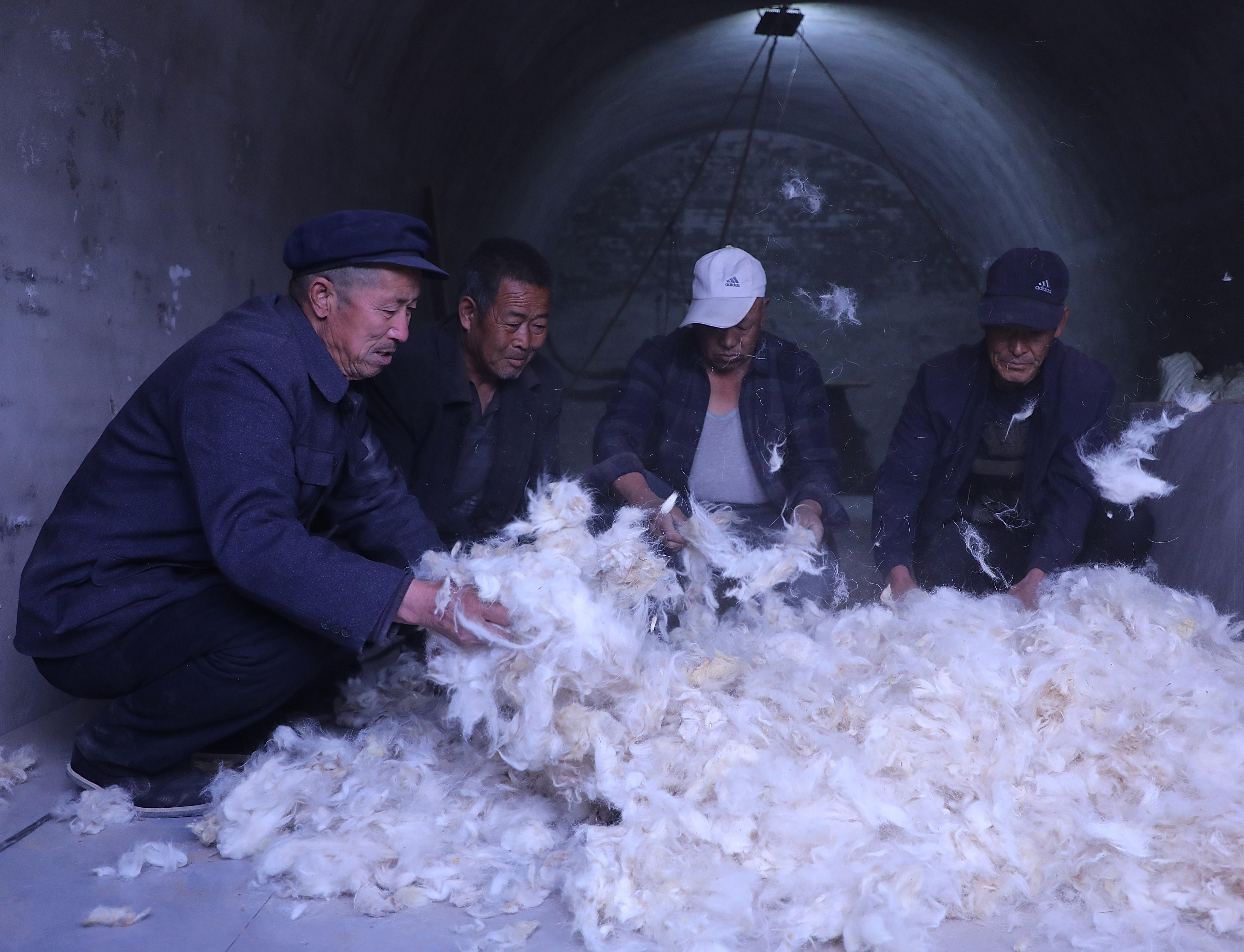第一道工序是撿毛。匠人們把所需羊毛倒在平整的窯掌地上,幾人圍坐,仔細(xì)挑出里面的雜質(zhì)、羊糞。