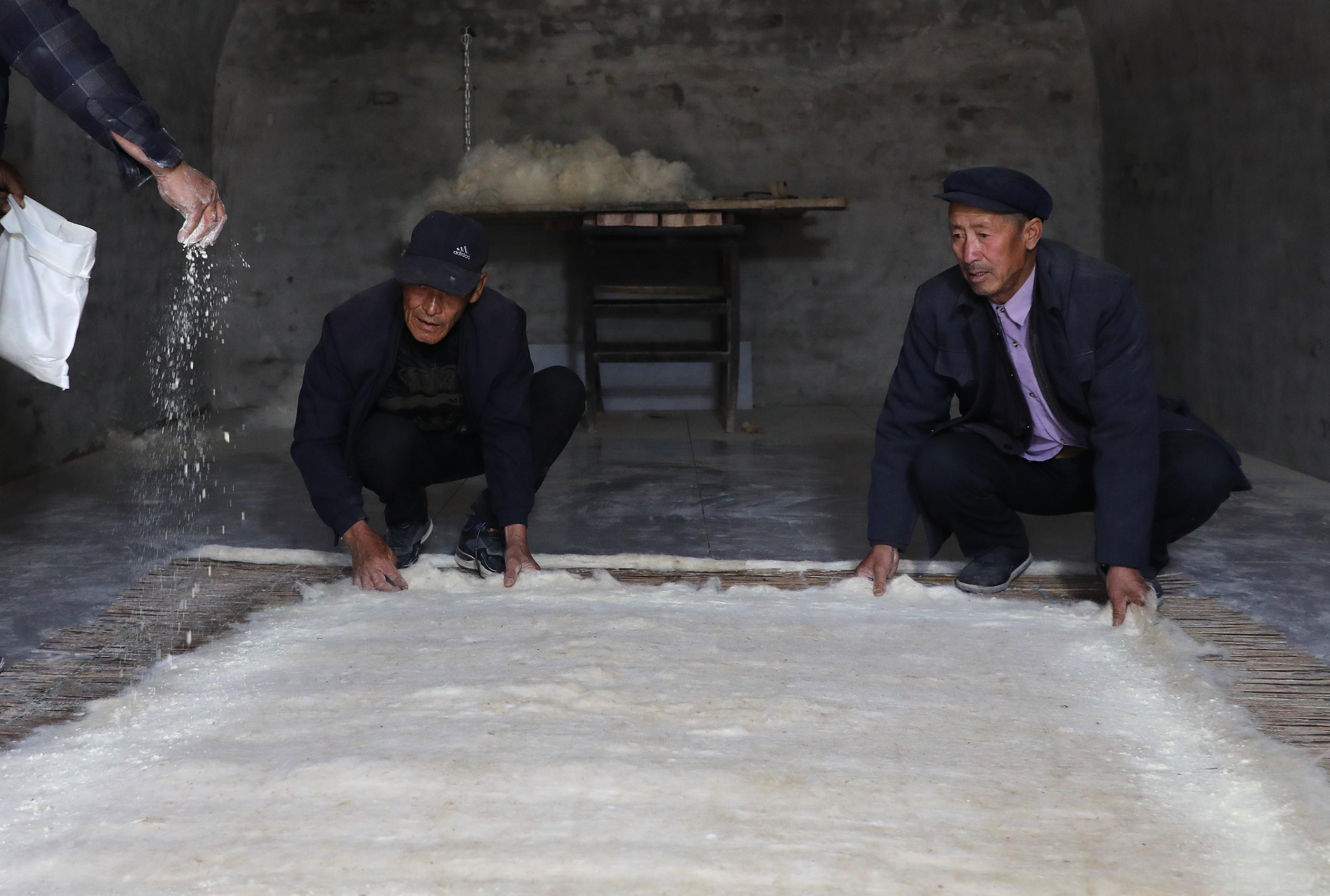 第七道撒面,在噴過油和水的羊毛上撒上糜面,輕拍后再覆上一層羊毛。
