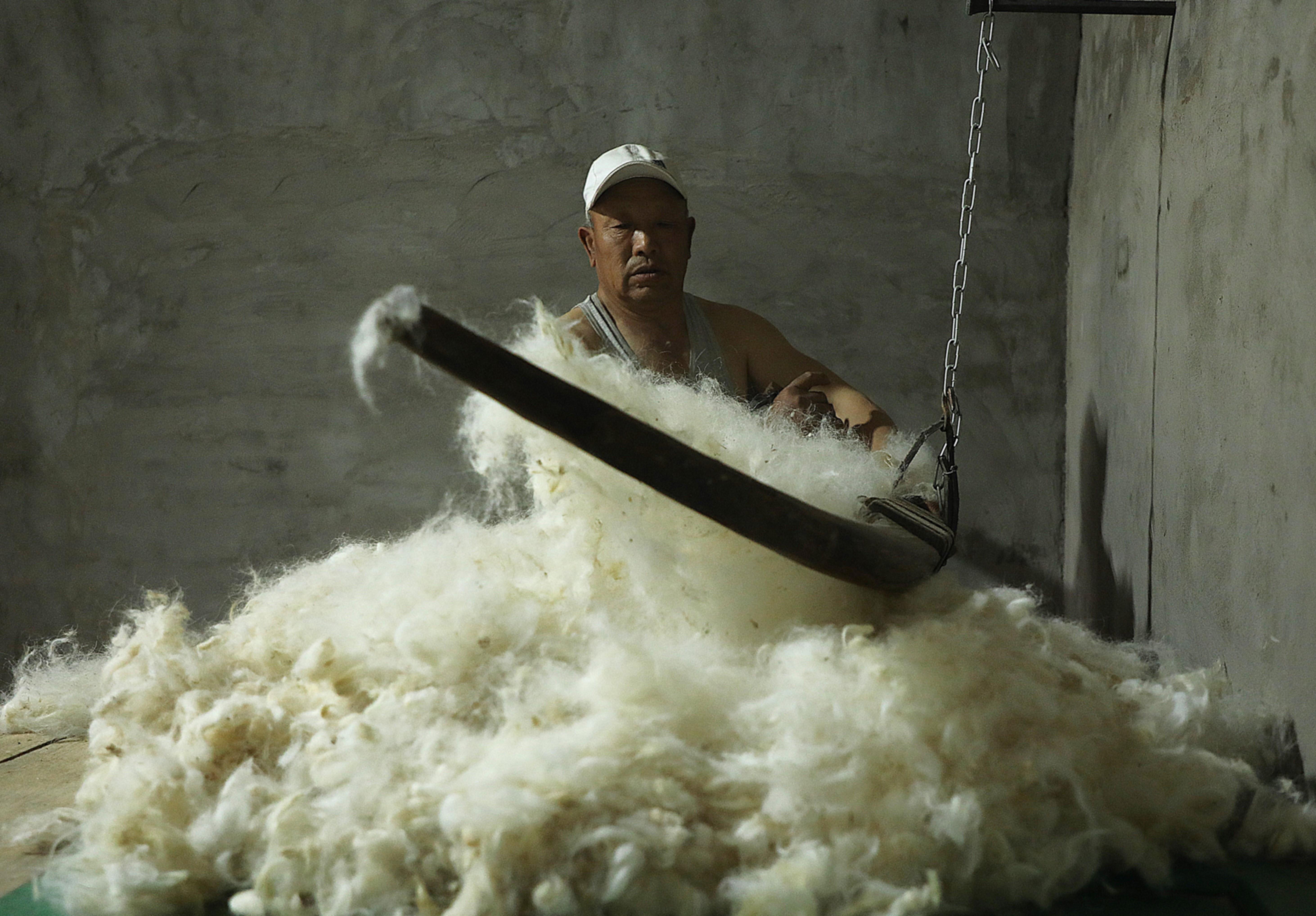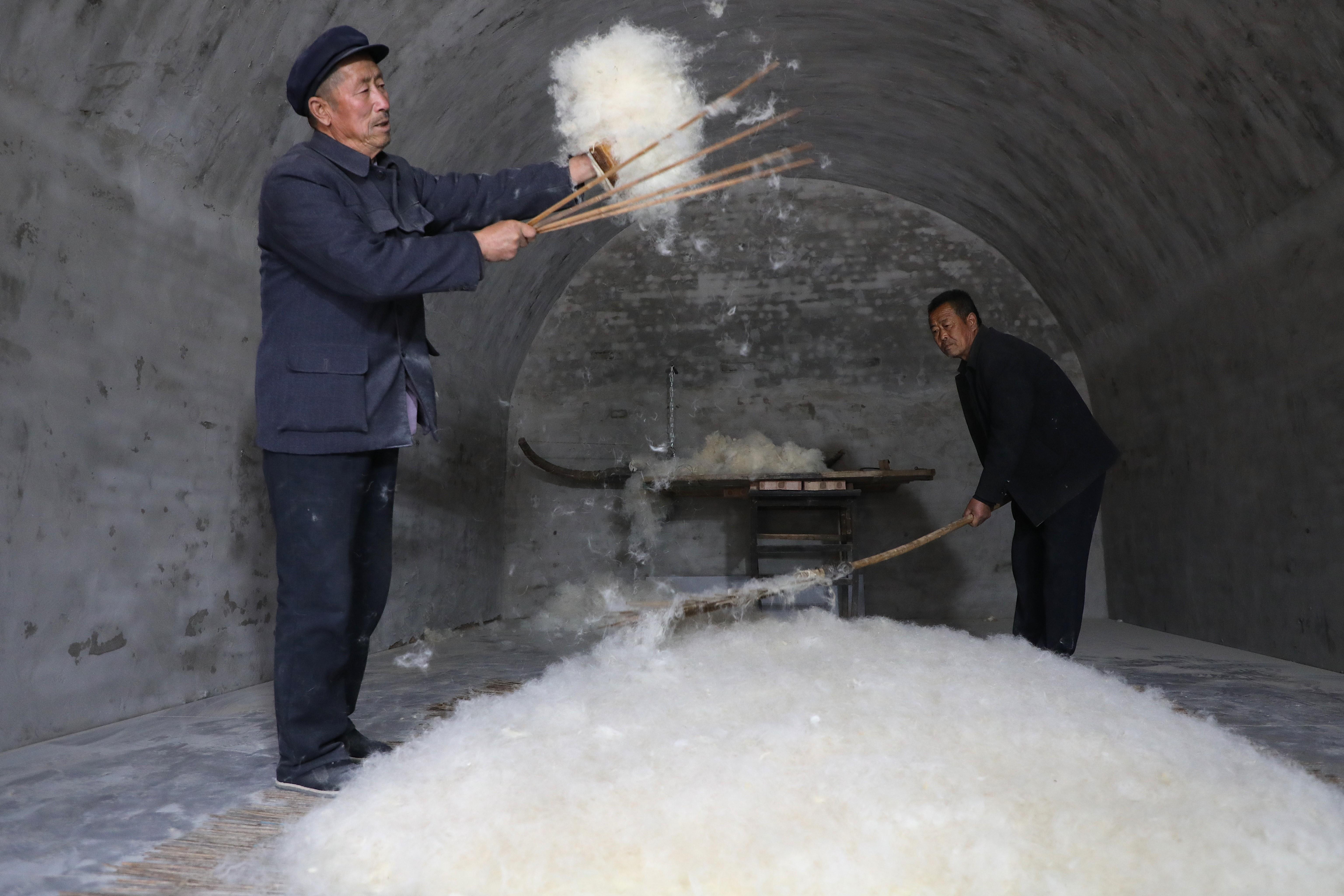 隨著弓弦顫動(dòng),“砰砰”聲中,羊毛如雪花般散開,變得蓬松輕盈。
