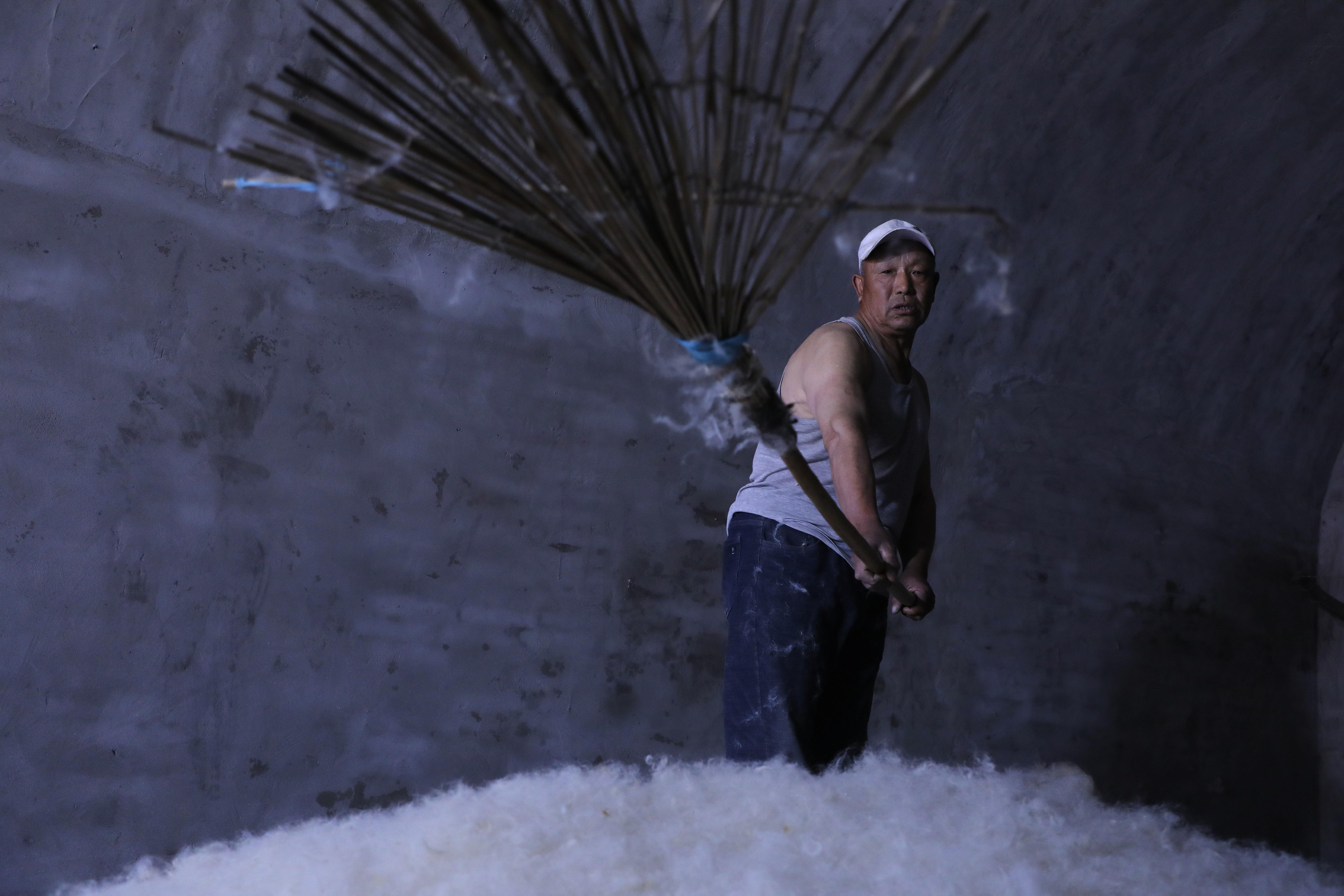 第四道是壓毛,用竹制壓扇輕輕拍打壓實(shí)。
