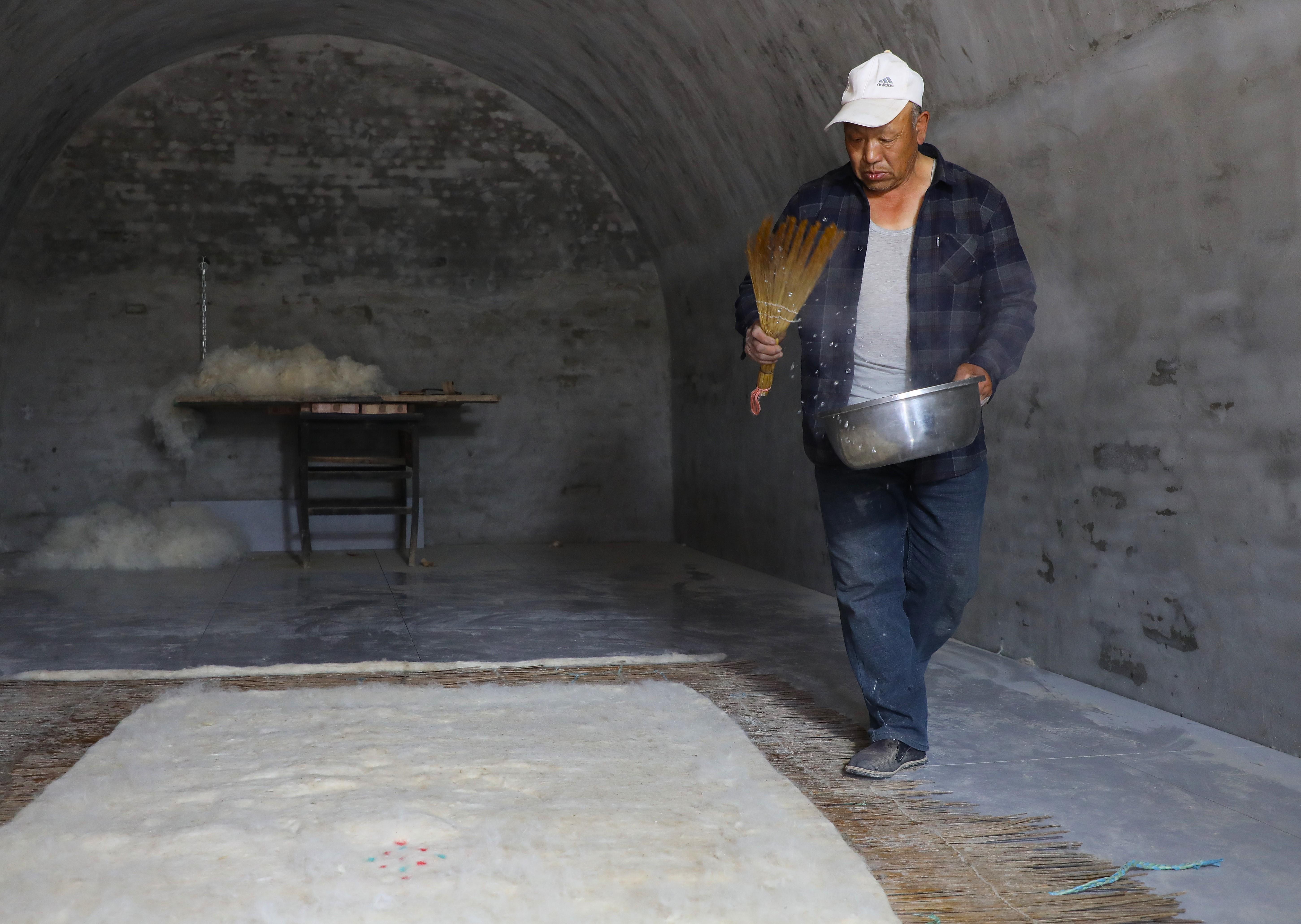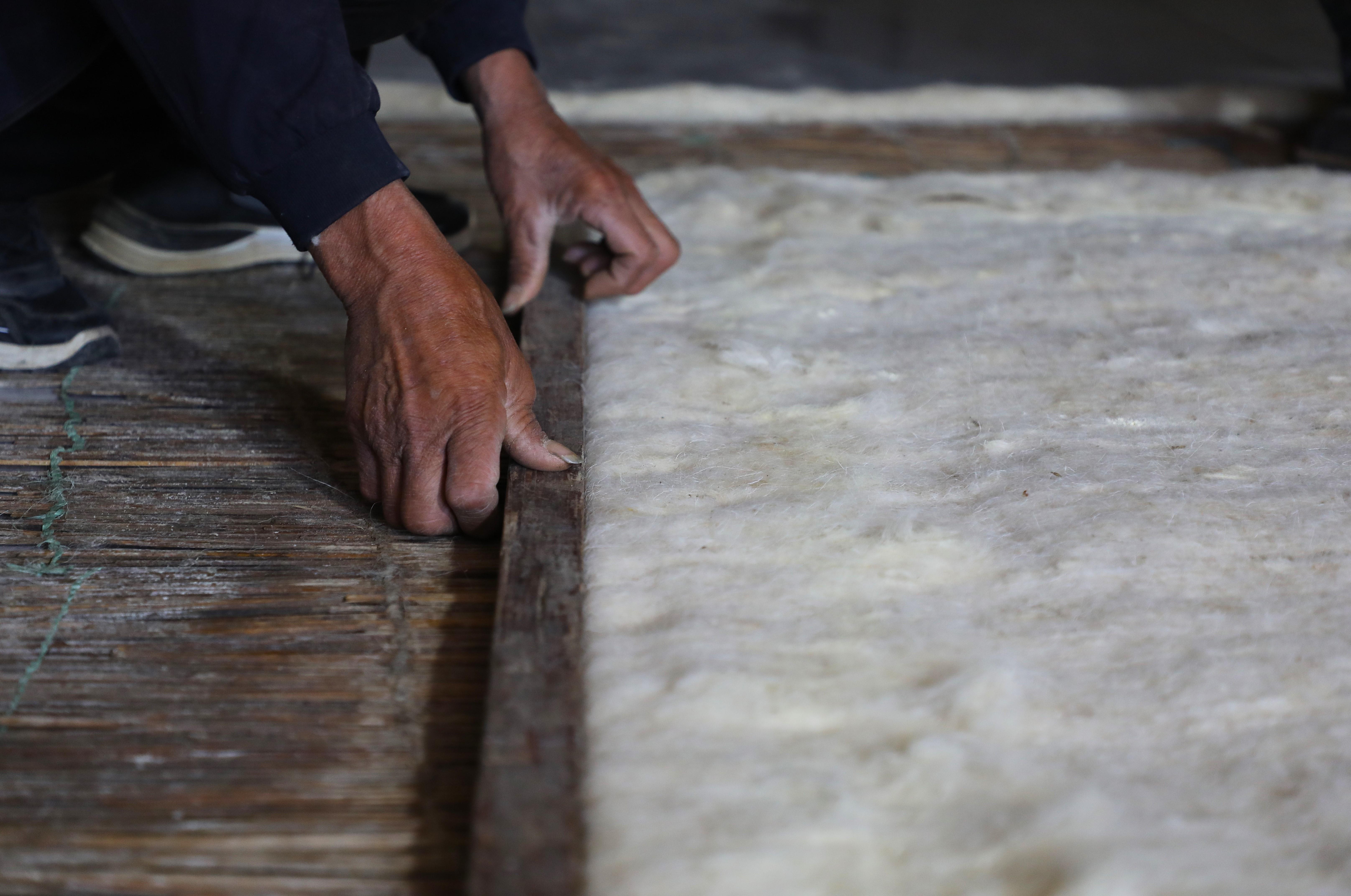 第三道工序是鋪毛,把白如棉絮的羊毛均勻鋪在提前備好的氈簾上。