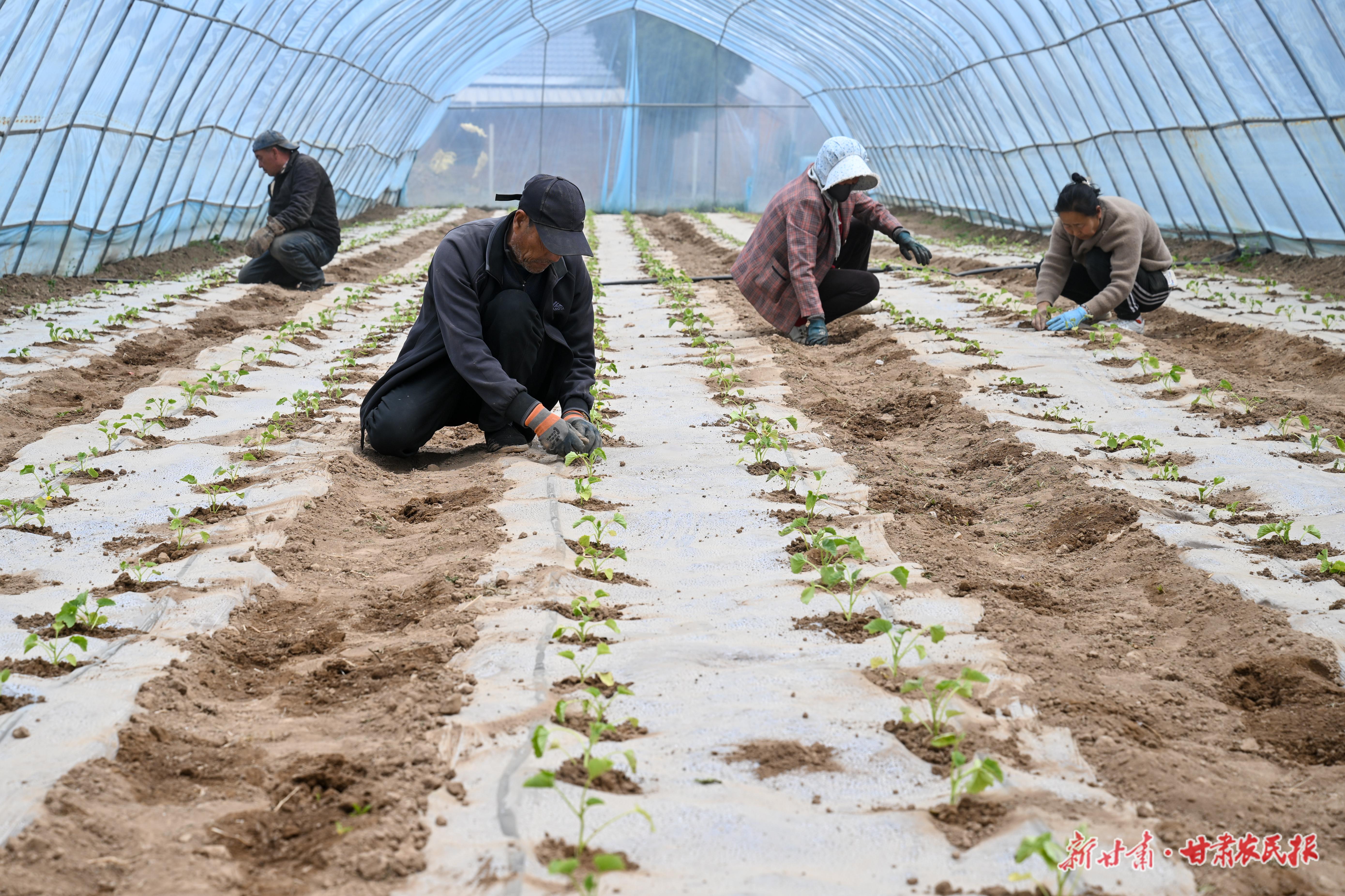 村民在合作社栽種甜瓜苗。俄少飛 攝