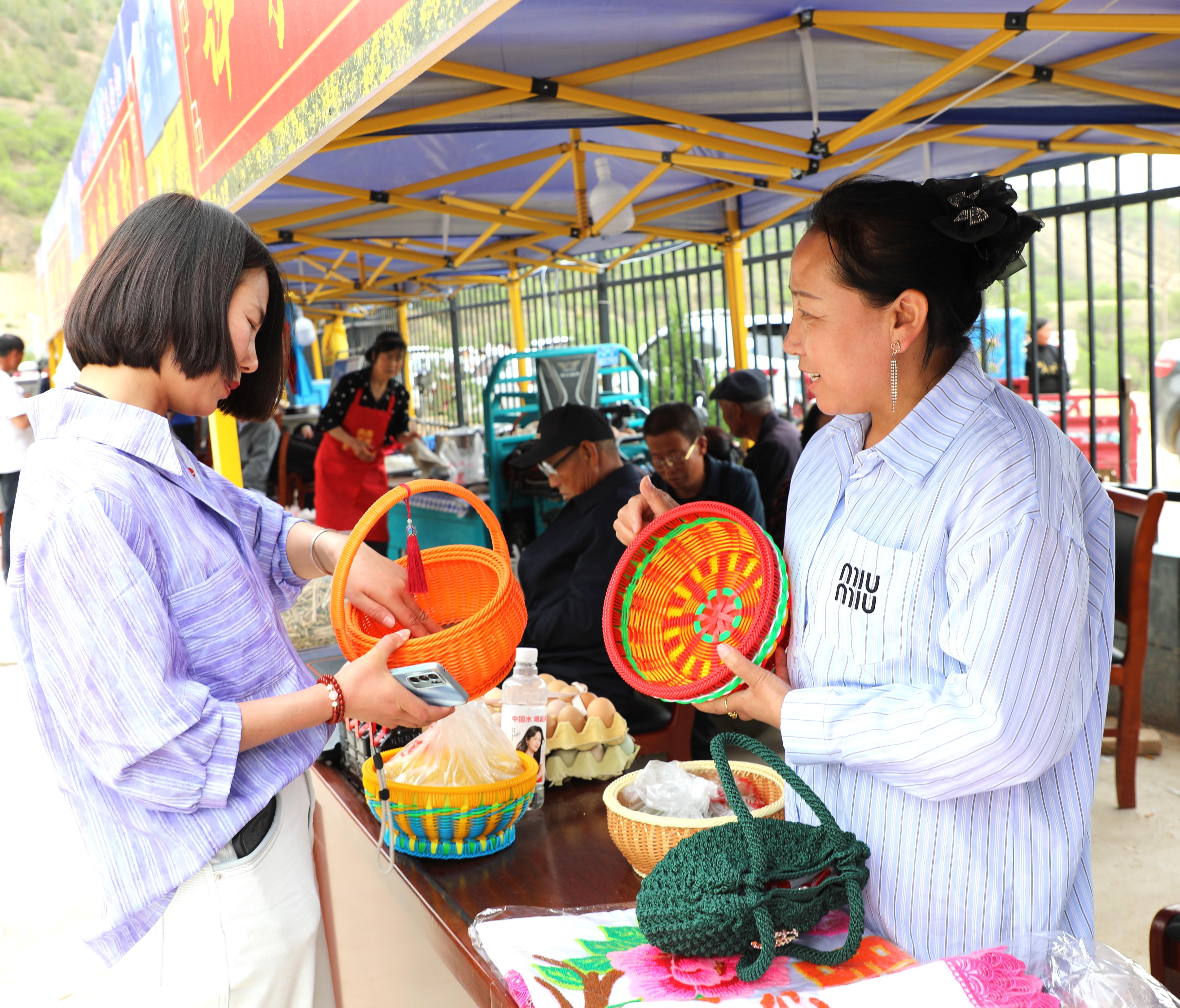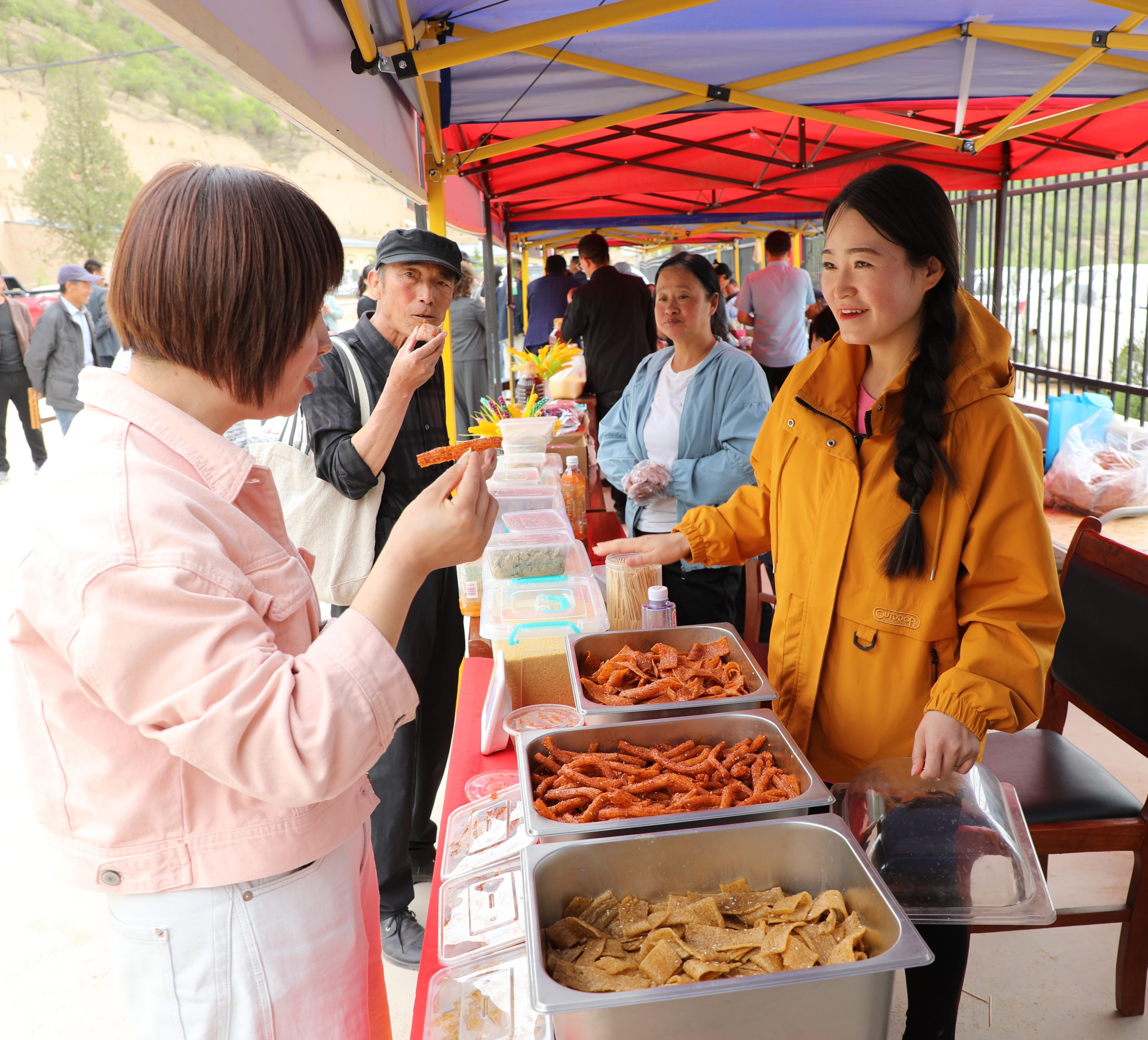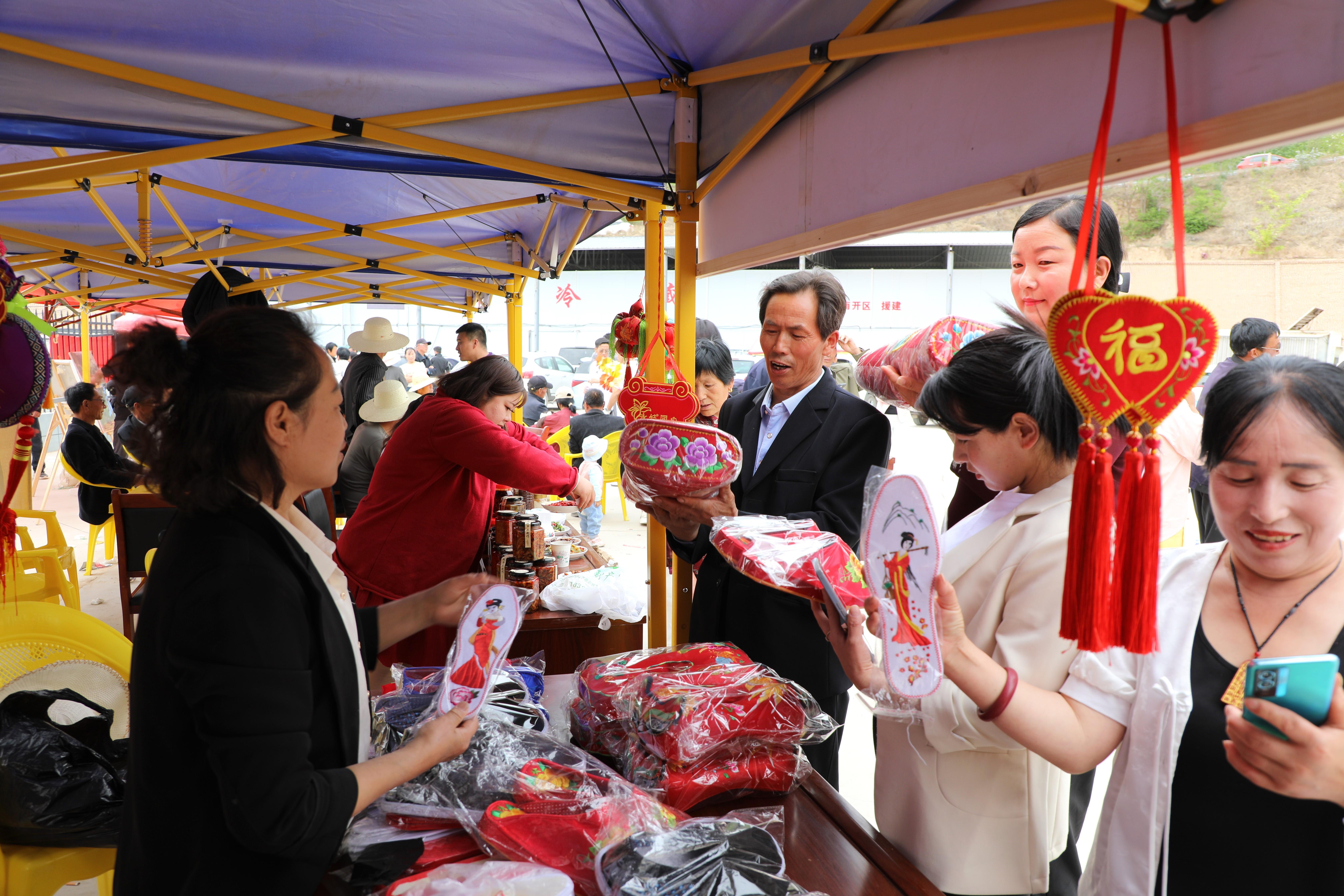 農(nóng)特產(chǎn)品展銷區(qū)成為展示鄉(xiāng)村魅力的重要窗口。蕎面、燃面、瓜子、黃花菜、小米等農(nóng)特產(chǎn)品琳瑯滿目,讓人目不暇接。刺繡、剪紙等非遺產(chǎn)品也吸引了不少游客駐足欣賞,精美的刺繡針法細膩,栩栩如生;剪紙作品線條流暢,寓意深刻,展現(xiàn)了當(dāng)?shù)厣詈竦奈幕滋N。