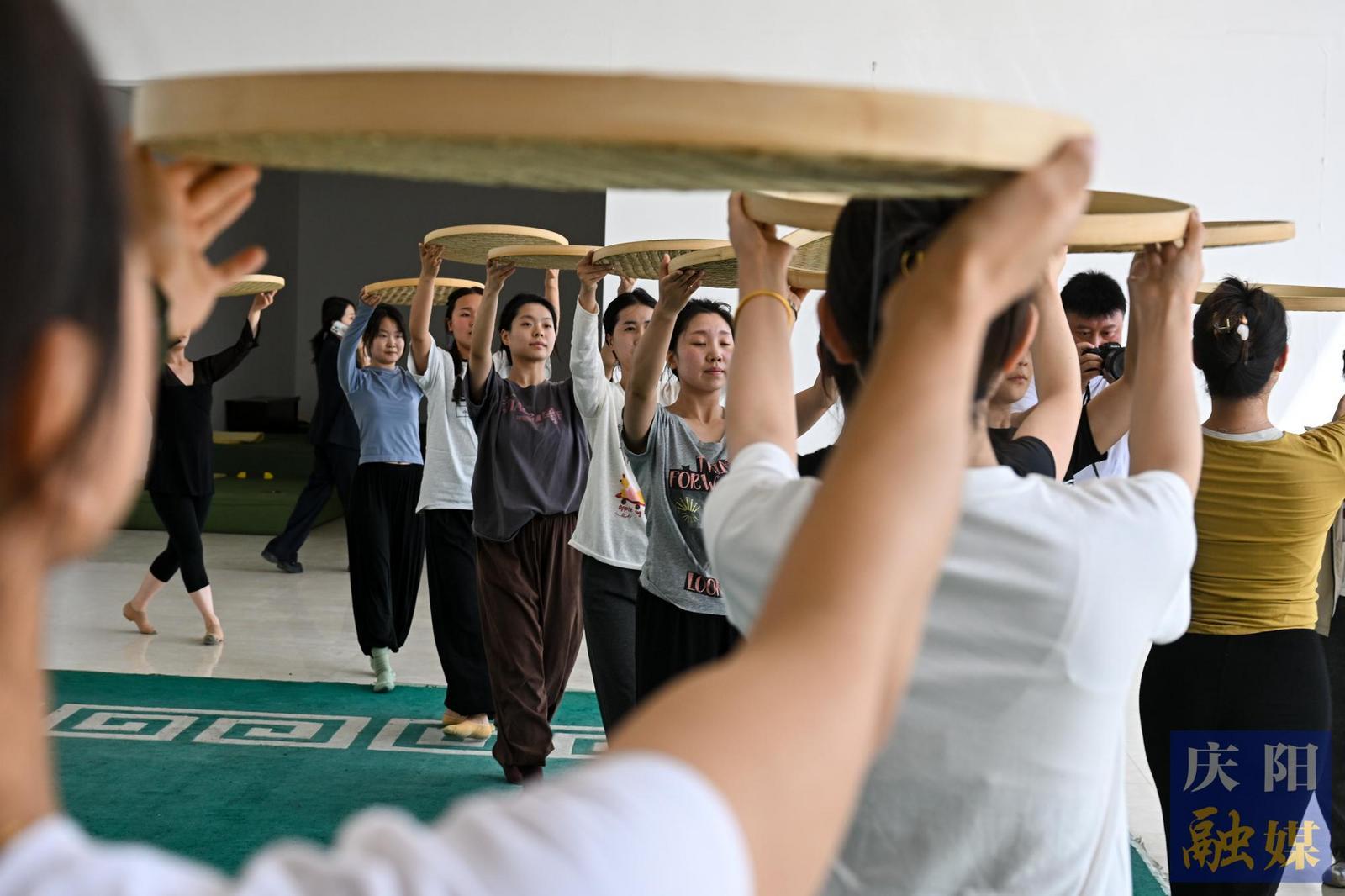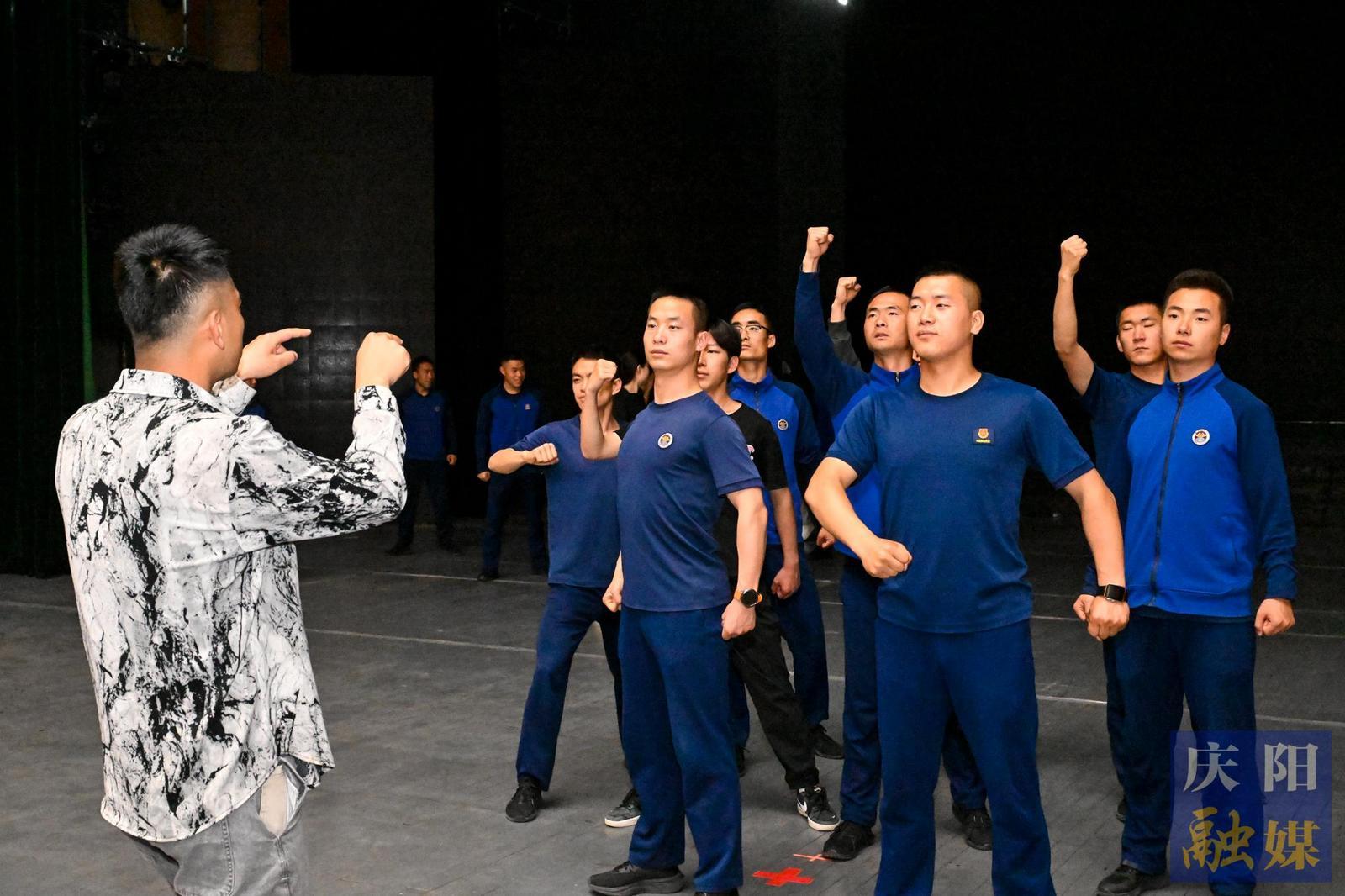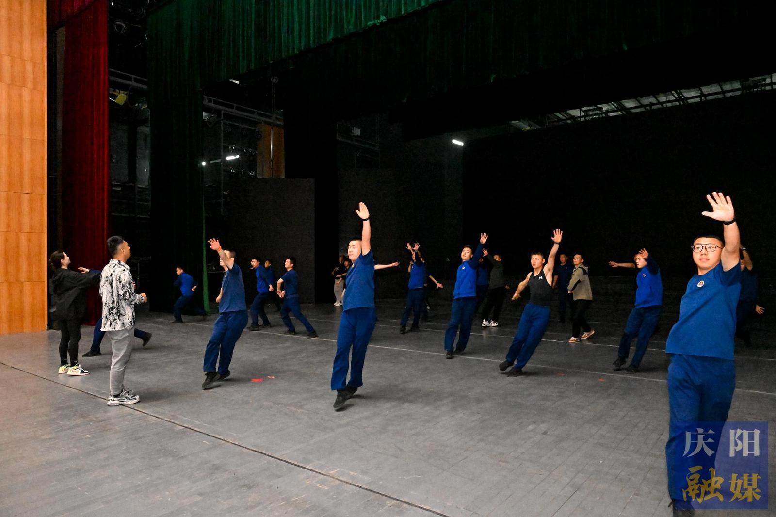 第二十屆慶陽(yáng)香包民俗文化節(jié)演職人員在慶陽(yáng)隴劇院排練舞蹈《能源新都 工業(yè)脊梁》。