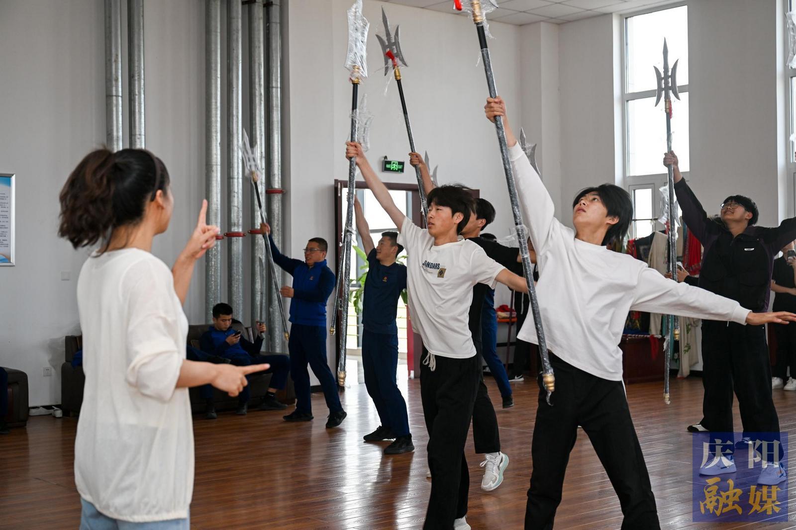 第二十屆慶陽(yáng)香包民俗文化節(jié)演職人員在慶陽(yáng)隴劇院排練舞蹈《邊塞風(fēng)云》。