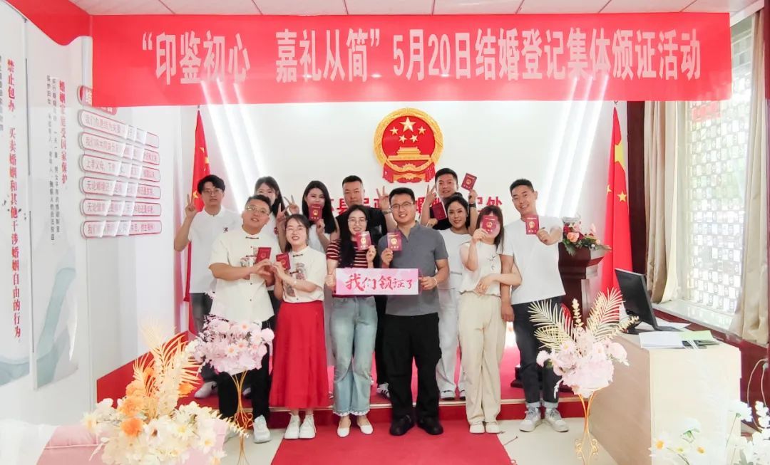 集體頒證儀式顯莊重、見溫情。以“印鑒初心嘉禮從簡(jiǎn)”為主題的“5·20”結(jié)婚登記集體頒證活動(dòng),將法律認(rèn)證與傳統(tǒng)禮儀融合,詢問新人結(jié)婚意愿、告知領(lǐng)取結(jié)婚證的法律意義、集體宣讀結(jié)婚誓詞、頒發(fā)結(jié)婚證等環(huán)節(jié)強(qiáng)化婚姻神圣感,57對(duì)新人用實(shí)際行動(dòng)踐行“重登記 輕儀式”新風(fēng)尚。