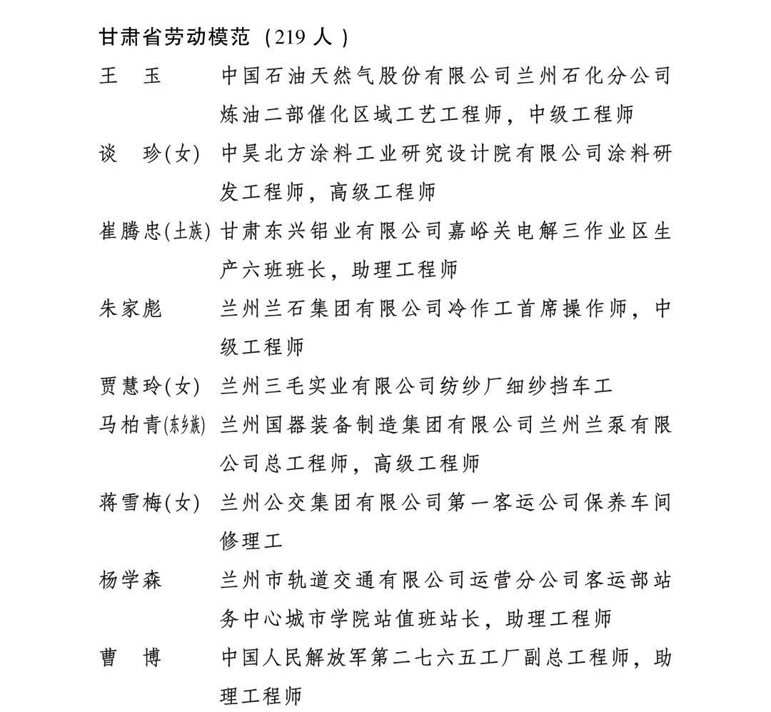 為表彰先進典型、凝聚奮進力量,激勵引導(dǎo)全省人民奮進新征程、再創(chuàng)新業(yè)績,省委、省政府決定授予王玉等219人甘肅省勞動模范稱號,授予馬蘭紅等79人甘肅省先進工作者稱號。希望獲得表彰的同志,珍惜榮譽、永葆本色,堅韌不拔、再立新功,充分發(fā)揮模范帶頭作用,激勵全省廣大職工群眾踴躍投身到推動甘肅發(fā)展、造福隴原人民的火熱實踐。