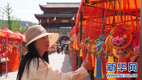 5月28日,游客在甘肅省慶陽(yáng)市鎮(zhèn)原縣北石窟驛景區(qū)外選購(gòu)香包。新華網(wǎng)發(fā)(李登博 攝)