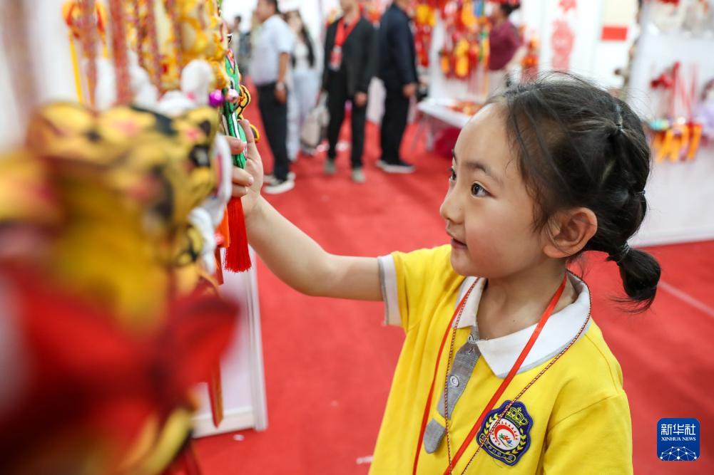 5月29日,小朋友在慶陽(yáng)香包民俗文化節(jié)非遺沉浸體驗(yàn)區(qū)挑選香包。新華社記者 郎兵兵 攝
