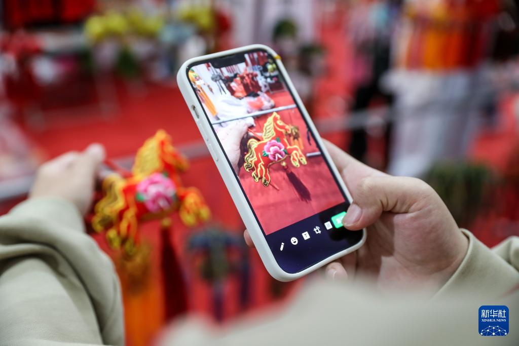 5月29日,市民在慶陽(yáng)香包民俗文化節(jié)非遺沉浸體驗(yàn)區(qū)拍攝生肖“馬”香包。新華社記者 郎兵兵 攝