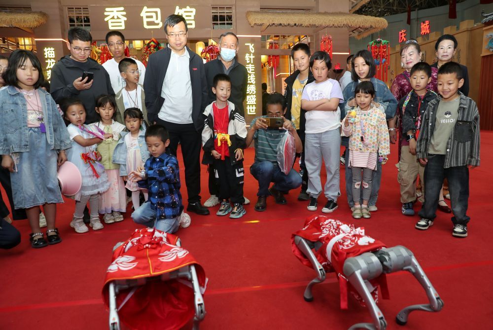 智慧文旅館中,機器人、機器狗身著剪紙服飾走秀展演,南梁紅色研學VR沉浸式體驗等項目,吸引了大量游客駐足互動。