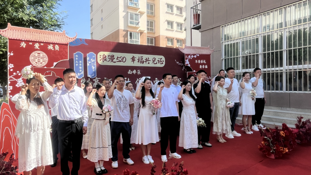 “集體領證啦”伴隨著陣陣掌聲,12對新人手挽手走過“新風紅毯”,在“不要彩禮·要幸?!焙灻麎ι相嵵睾炏卤舜藧鄣氖难?,用實際行動為傳統(tǒng)婚俗注入文明新內涵。這場“浪漫520·幸福共見證”抵制高額彩禮、倡導文明婚俗集體頒證活動只是西峰區(qū)移風易俗創(chuàng)新實踐的一個縮影。從AI漫畫“破圈”傳播到黨員干部“硬核”示范,從文藝演出浸潤鄉(xiāng)土到云平臺精準服務,西峰區(qū)以“四度”創(chuàng)新,讓文明新風從“紙面”落到“心尖”。