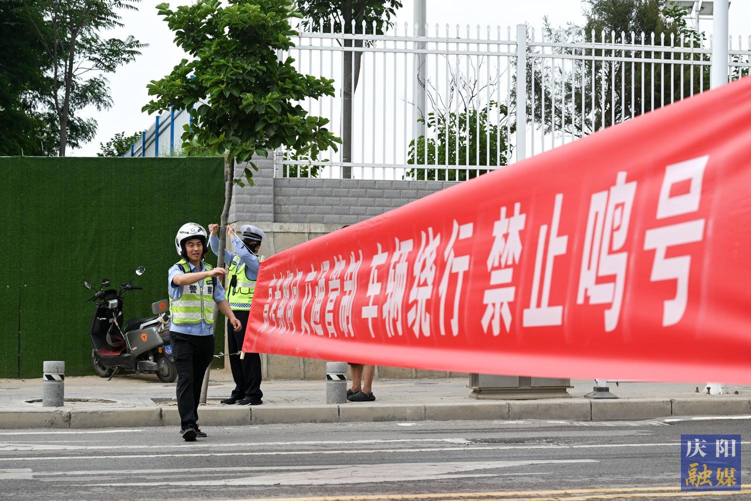 交警管制考場(chǎng)外街道,提醒車輛禁止鳴笛。
