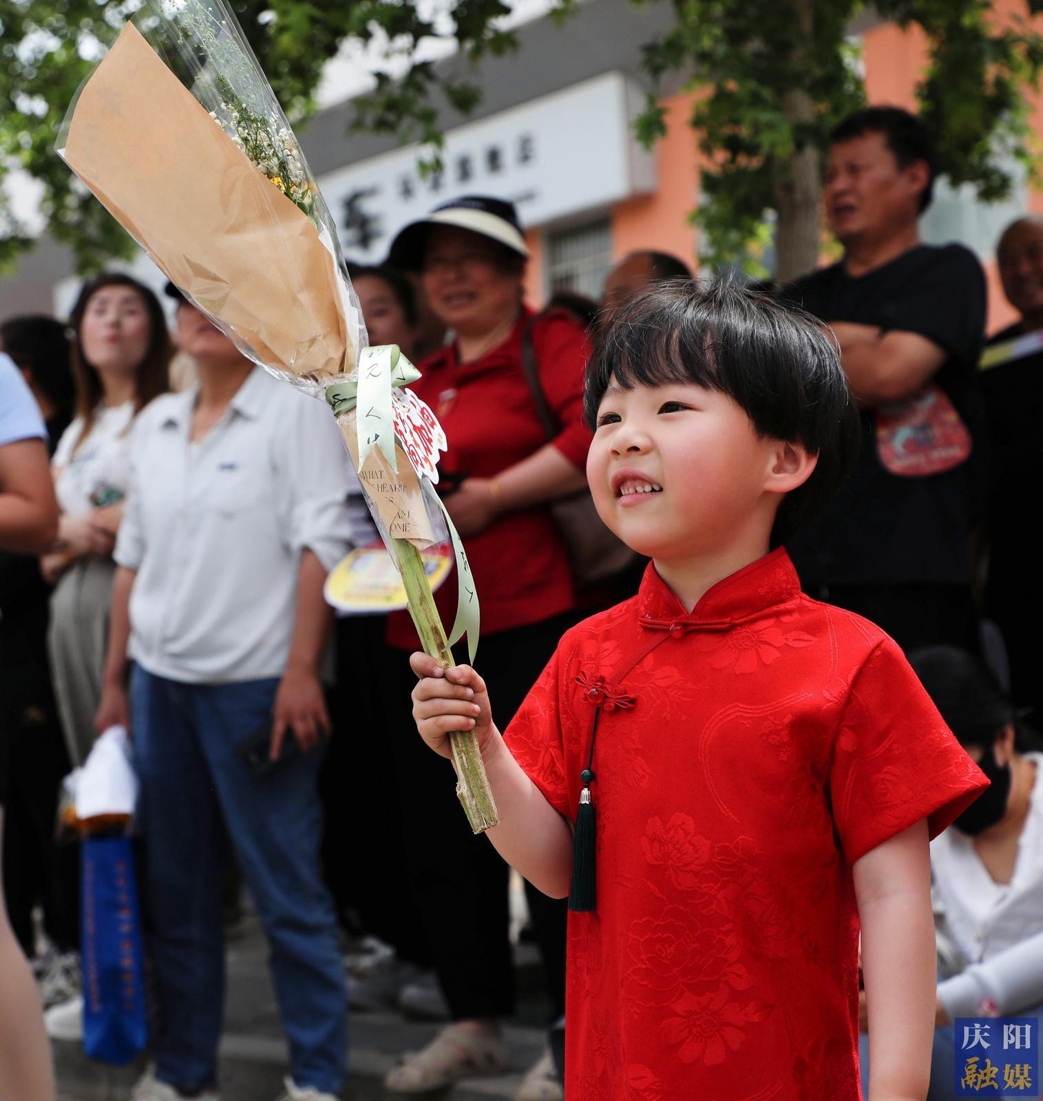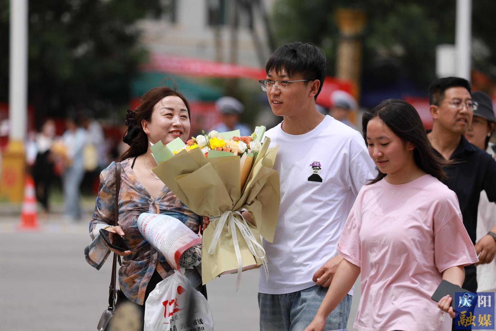 家長(zhǎng)為結(jié)束“首戰(zhàn)”的考生遞上鮮花以示鼓勵(lì)。