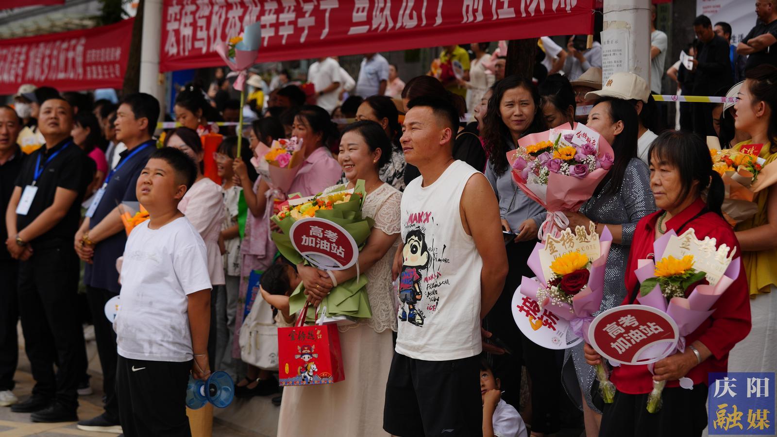 家長(zhǎng)為考生準(zhǔn)備鮮花,加油打氣。