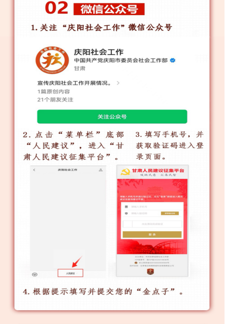 線上渠道。建議人可通過掃描慶陽市人民政府門戶網(wǎng)站“慶陽人民建議征集”二維碼飄窗,或關(guān)注“慶陽社會(huì)工作”微信公眾號(hào),通過“人民建議”窗口提交建議。