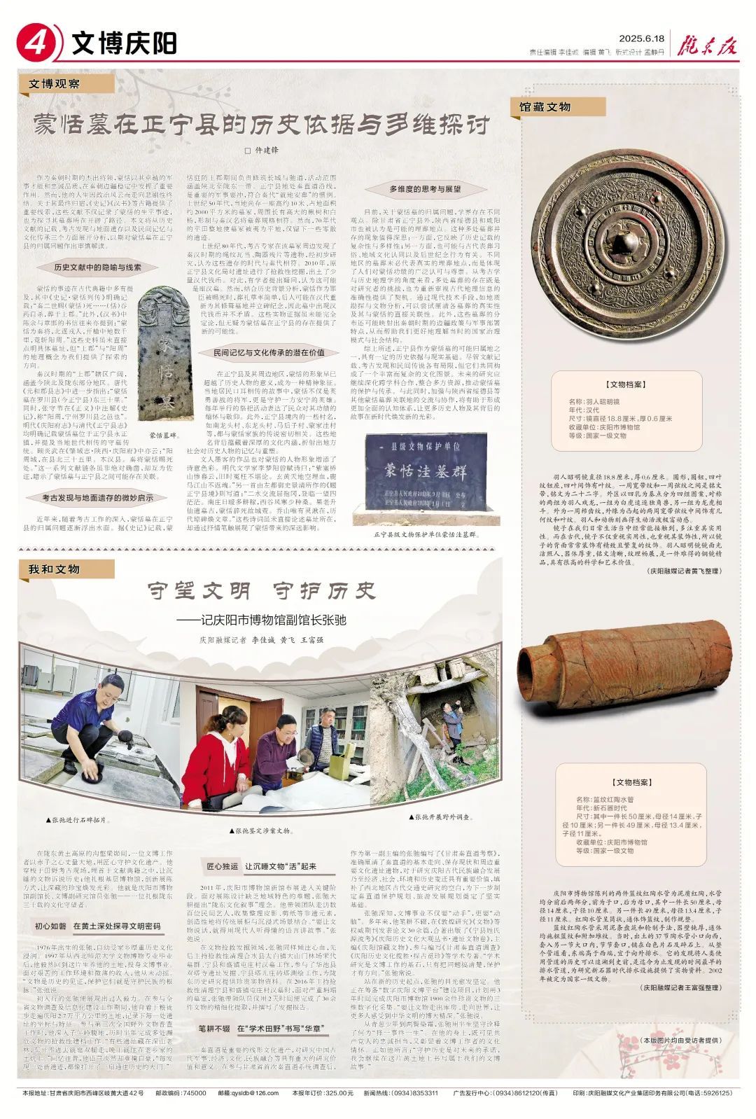 張馳深知,文博事業(yè)不僅要“動(dòng)手”,更要“動(dòng)腦”。多年來,他筆耕不輟,在《敦煌研究》《文物》等權(quán)威期刊發(fā)表論文30余篇,合著出版了《寧縣姓氏源流考》《慶陽歷史文化大觀叢書·遺址文物卷》,主編《慶陽館藏文物》,參與編寫《甘肅秦直道調(diào)查》《慶陽歷史文化攬勝·探古覓珍》等學(xué)術(shù)專著?!皩W(xué)術(shù)研究是文博工作的基石,只有把問題搞清楚,保護(hù)才有方向。”張馳常說。