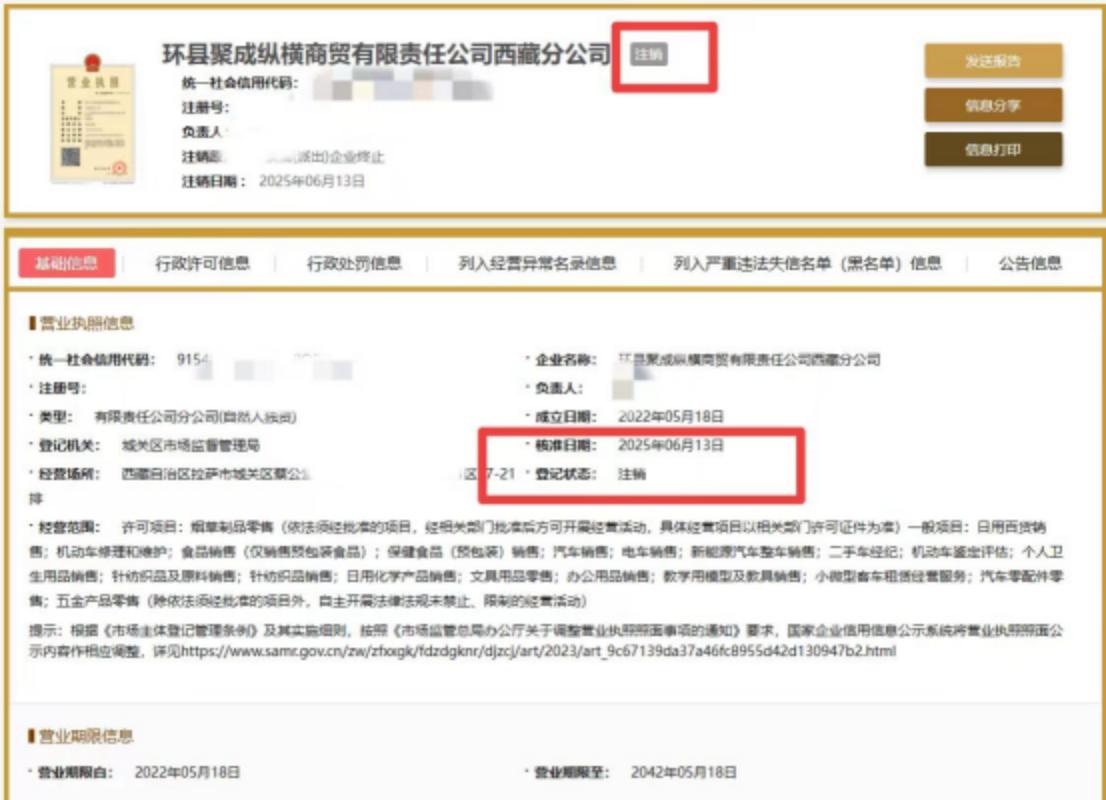 隨后,工作人員詳細了解了分公司注銷的相關流程,隨后按照《國家市場監(jiān)管總局材料規(guī)范(2022版)》,通過西藏市場監(jiān)管政務服務網(wǎng)在線提交了注銷申請,全流程采用“全程電子化登記”方式辦理。1個工作日后,西藏自治區(qū)拉薩市城關區(qū)市場監(jiān)管局便審核通過了該申請,并免費郵寄了注銷登記通知書,該分公司順利注銷。