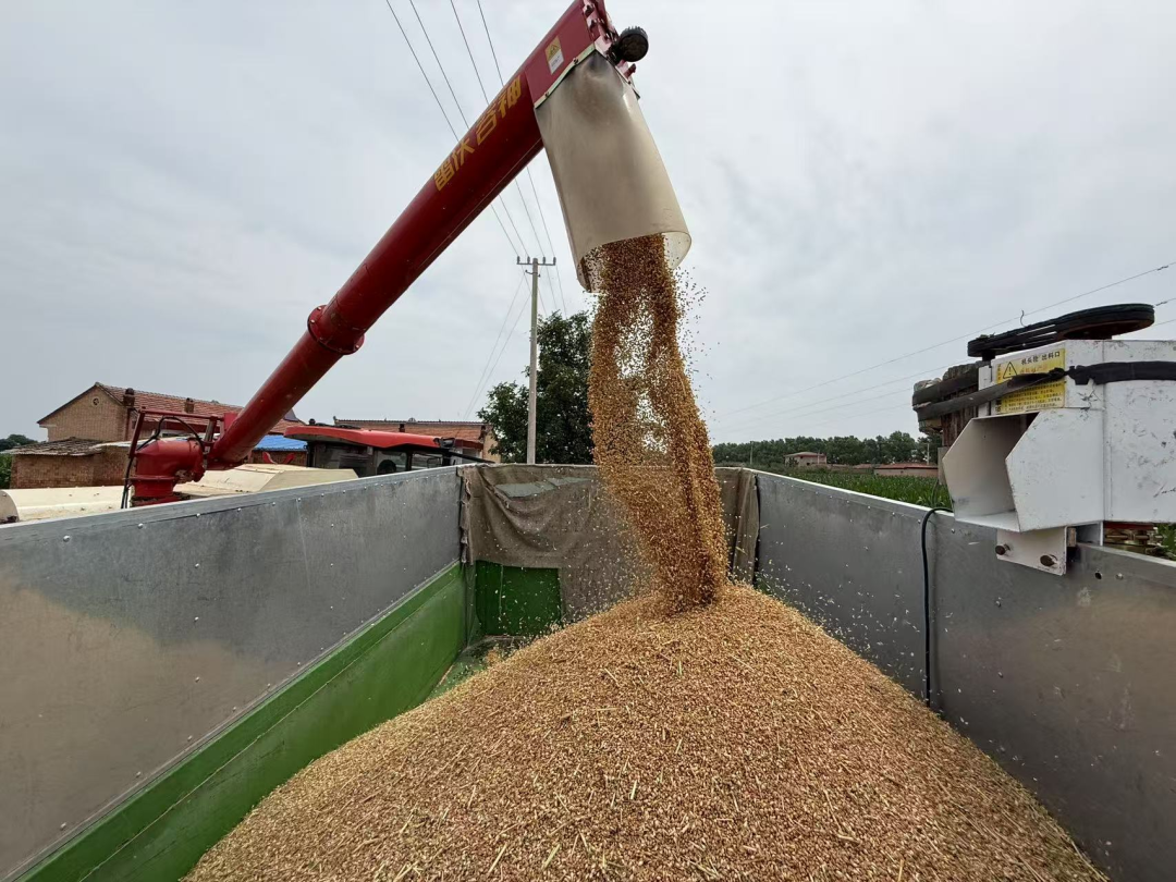6月24日,記者在永正鎮(zhèn)紀(jì)村一處麥田里看到,隆隆的機(jī)器聲不停作響,收割機(jī)往來穿梭,金燦燦的麥粒從脫粒箱中傾瀉而出,農(nóng)用運(yùn)輸車緊隨其后裝運(yùn)新糧,一派繁忙景象。