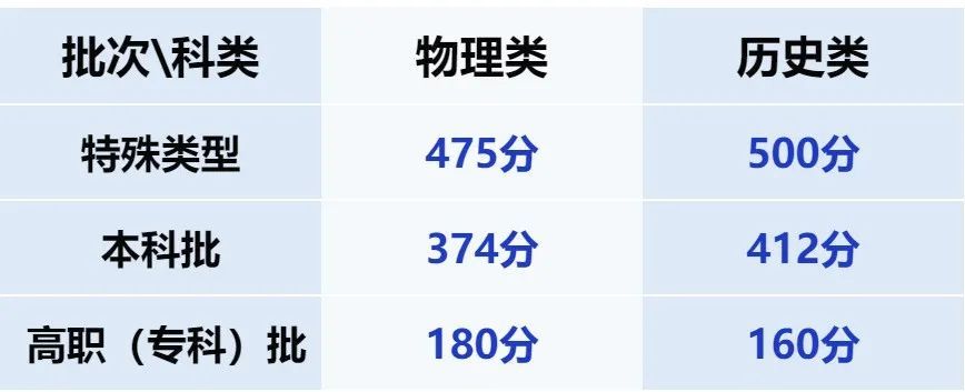 注:1.藝術(shù)類專業(yè)校考文化課錄取最低控制分?jǐn)?shù)線執(zhí)行普通類錄取最低控制分?jǐn)?shù)線,即物理類374分,歷史類412分,專業(yè)課合格,相應(yīng)專業(yè)統(tǒng)考合格。2.戲曲類專業(yè)省際聯(lián)考文化課錄取最低控制分?jǐn)?shù)線187分,專業(yè)課合格。