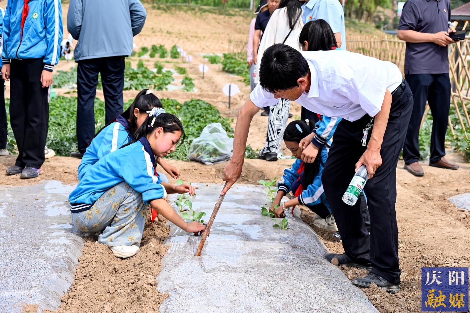 華池縣委老干部服務(wù)管理所聯(lián)合縣關(guān)工委組織開展主題實(shí)踐活動(dòng),青少年在南梁鎮(zhèn)農(nóng)耕研學(xué)示范田里種植蔬菜。
