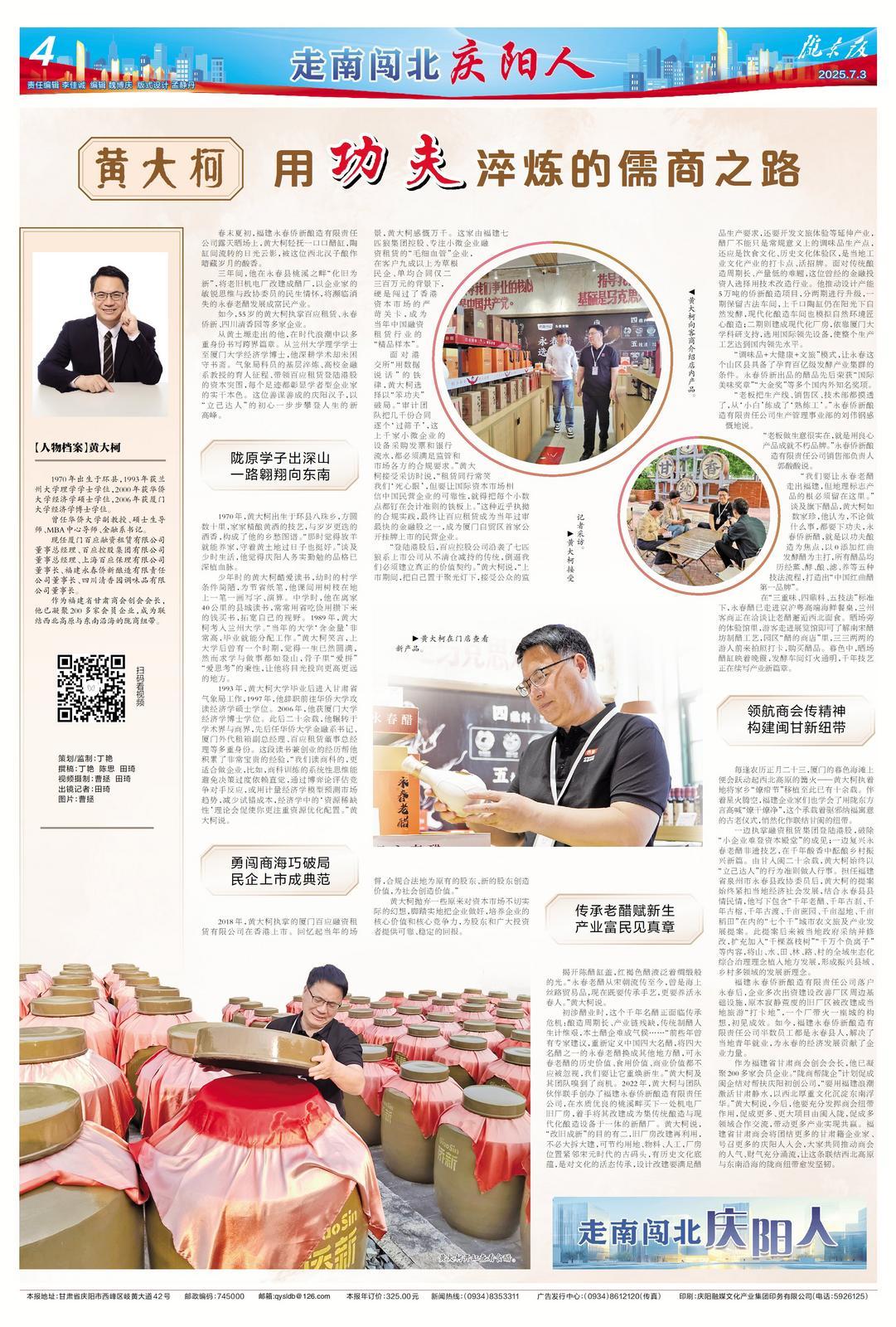 一邊執(zhí)掌融資租賃集團(tuán)登陸港股,破除“小企業(yè)難登資本殿堂”的成見;一邊復(fù)興永春老醋非遺技藝,在千年酸香中醞釀鄉(xiāng)村振興新篇。由甘入閩二十余載,黃大柯始終以“立己達(dá)人”的行為準(zhǔn)則做人行事。擔(dān)任福建省泉州市永春縣政協(xié)委員后,黃大柯的提案始終緊扣當(dāng)?shù)亟?jīng)濟(jì)社會(huì)發(fā)展,結(jié)合永春縣縣情民情,他寫下包含“千年老醋、千年古剎、千年古榕、千年古渡、千畝蔗園、千畝濕地、千畝稻田”在內(nèi)的“七個(gè)千”城市農(nóng)文旅及產(chǎn)業(yè)發(fā)展提案。此提案后來被當(dāng)?shù)卣杉{并修改,擴(kuò)充加入“千棵荔枝樹”“千萬個(gè)負(fù)離子”等內(nèi)容,將山、水、田、林、路、村的全域生態(tài)化綜合治理理念植入地方發(fā)展,形成振興縣域、鄉(xiāng)村多領(lǐng)域的發(fā)展新理念。
