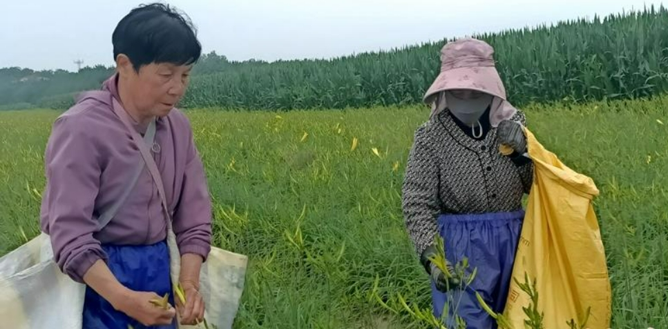 清晨,老索家門前已是人聲鼎沸。村民們步履匆匆,將一筐筐還綴著晶瑩露珠的金黃花蕾運來交售。稱重、記賬、付款,伴隨著此起彼伏的手機(jī)“滴滴”聲,一撥撥村民拿著收入,心滿意足地離開。與此同時,不遠(yuǎn)處的黃花菜種植基地里,同樣是一番繁忙景象。成片的金色花海隨風(fēng)輕漾,枝頭綴滿鮮嫩飽滿的花蕾,空氣里彌漫著醉人的清香。頭戴遮陽帽、身挎編織袋的村民們,正迎著晨露在田埂間穿梭。只見他們手指靈巧翻飛,一朵朵含苞待放的黃花便被精準(zhǔn)采擷入袋。為搶抓最佳采摘期,許多村民凌晨時分便已躬身于花田之中。