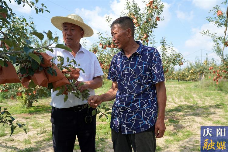 ▲張文輝(左一)與果農(nóng)查看蘋果長勢。