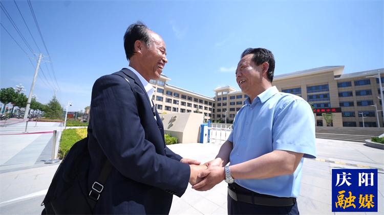 陳寶元與鎮(zhèn)原一中黨支部書(shū)記交流受助學(xué)生情況。