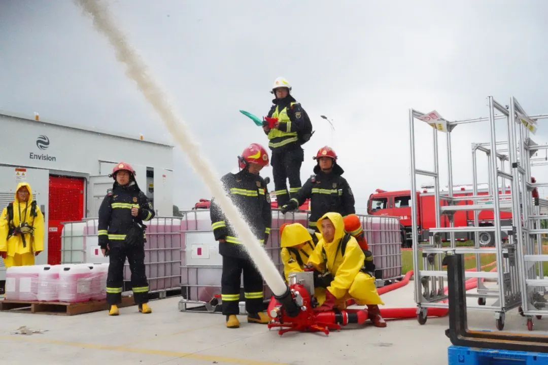 隨后,模擬成品區(qū)一儲(chǔ)能柜發(fā)生電池?zé)崾Э仄鸹?,?duì)員著防電服做好個(gè)人防護(hù),按照偵察、斷電、注水、冷卻等程序展開(kāi)處置,部署4門(mén)移動(dòng)炮強(qiáng)制冷卻科學(xué)處置。