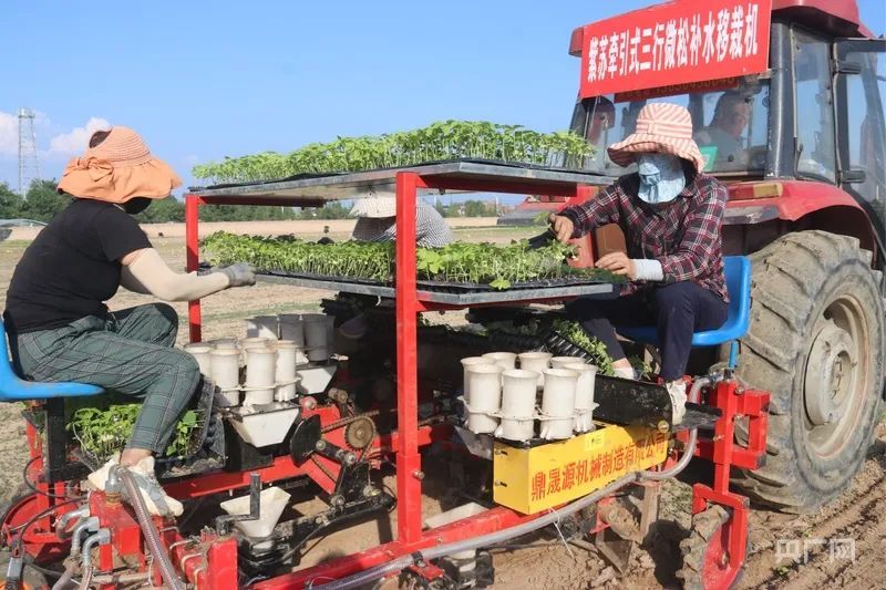 牽引式三行微松補水移栽機正在栽植紫蘇苗