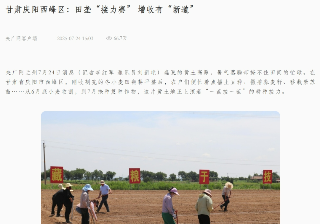 7月24日,“央廣網(wǎng)”客戶端發(fā)布《甘肅慶陽西峰區(qū):田壟“接力賽” 增收有“新道”》。