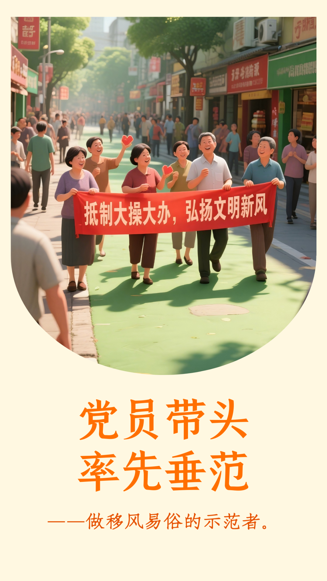 黨員帶頭,率先垂范——做移風(fēng)易俗的示范者。全市黨員干部、“兩代表一委員”、企事業(yè)單位職工、先進(jìn)模范等,要帶頭執(zhí)行紀(jì)律作風(fēng)要求,以身作則,率先垂范,不操辦、不參加“升學(xué)宴”“謝師宴”,不借機(jī)接受禮品、禮金。從嚴(yán)管好配偶、子女及身邊工作人員,自覺抵制大操大辦、吃喝送禮等行為,模范遵守廉潔自律各項(xiàng)規(guī)定,爭當(dāng)弘揚(yáng)文明新風(fēng)的帶頭人。