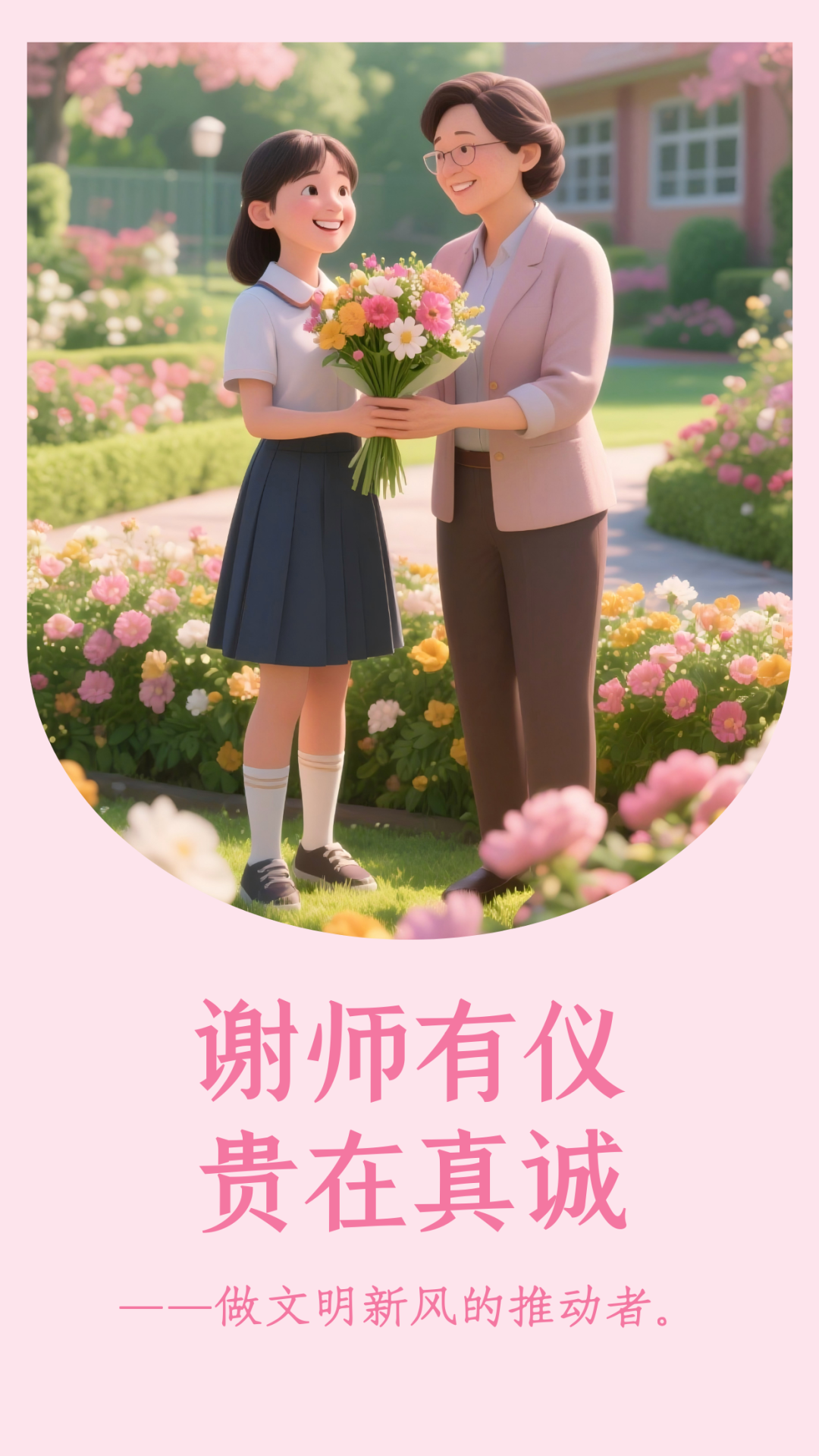 謝師有儀,貴在真誠——做文明新風(fēng)的推動者。一朝沐杏雨,終身念師恩。學(xué)子們當(dāng)以文明為筆,書寫感恩的時代答卷:自覺抵制大操大辦的陋習(xí),主動勸說家人摒棄鋪張,用一張合影定格師生情誼,用一紙賀卡傾訴真心,用一束鮮花傳遞敬意。讓簡約而真摯的表達(dá),成為青春里最動人的“謝師禮”。