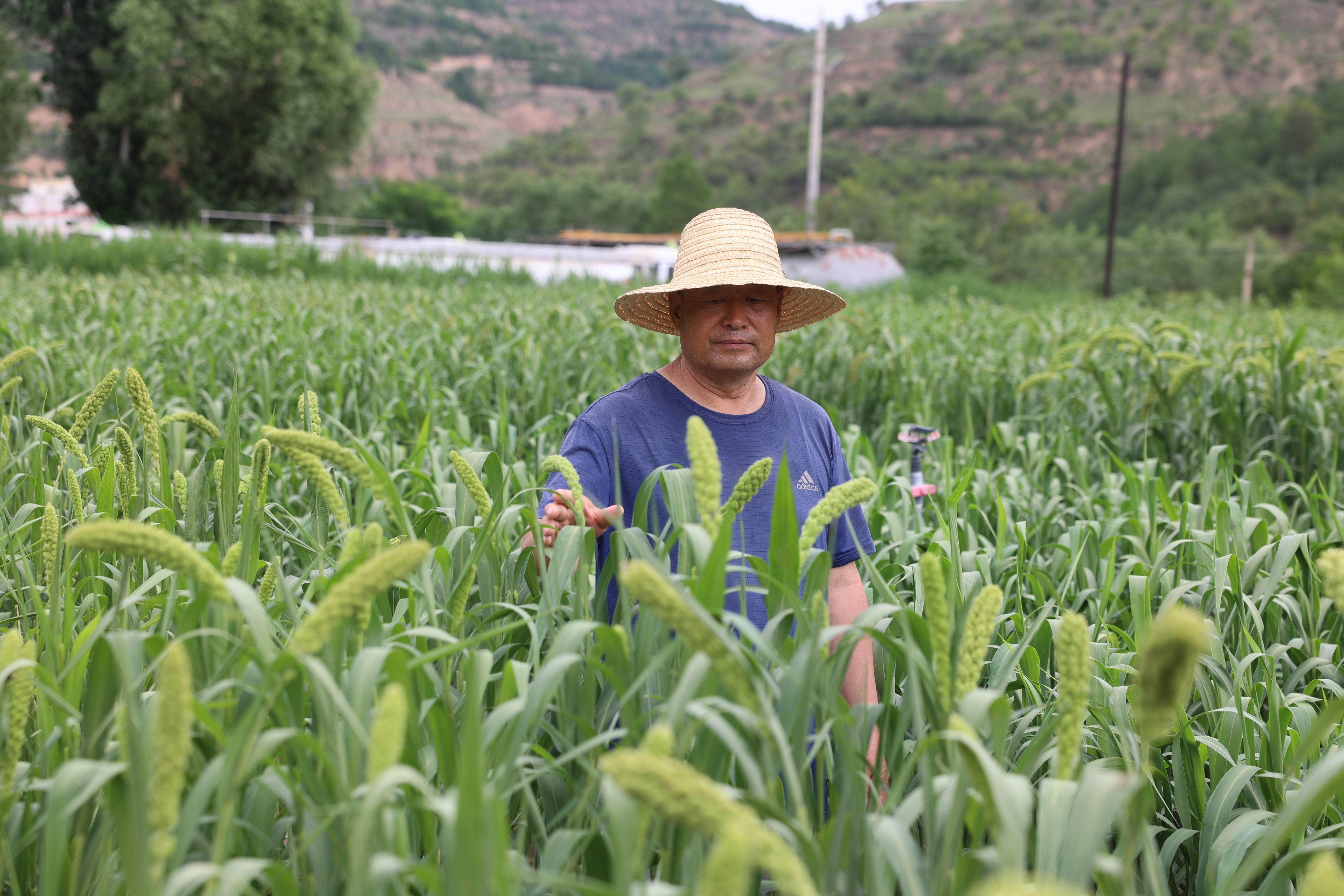 譙顯明查看谷子長勢。