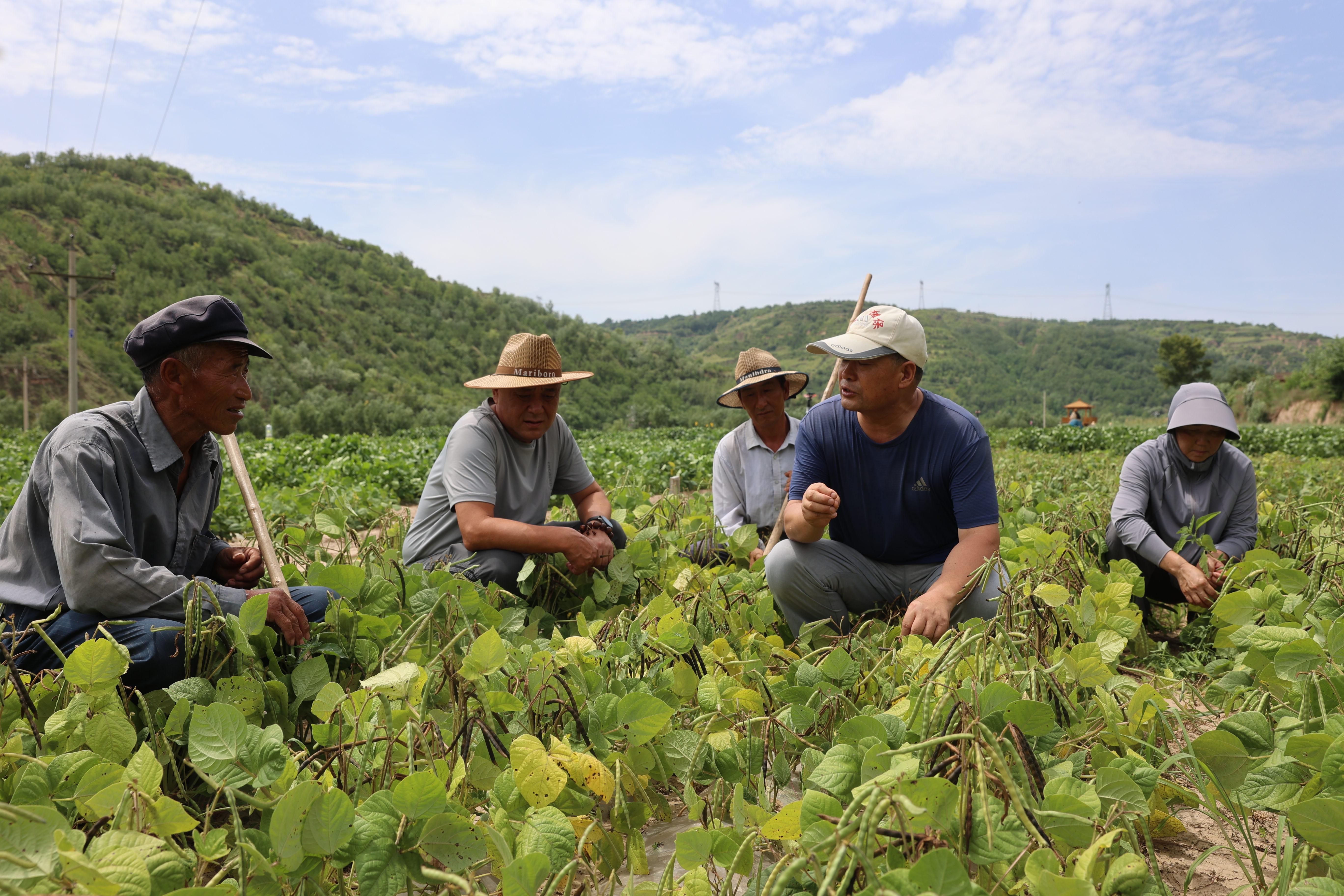 譙顯明(右二)與農(nóng)民探討紅小豆后期管理問題。