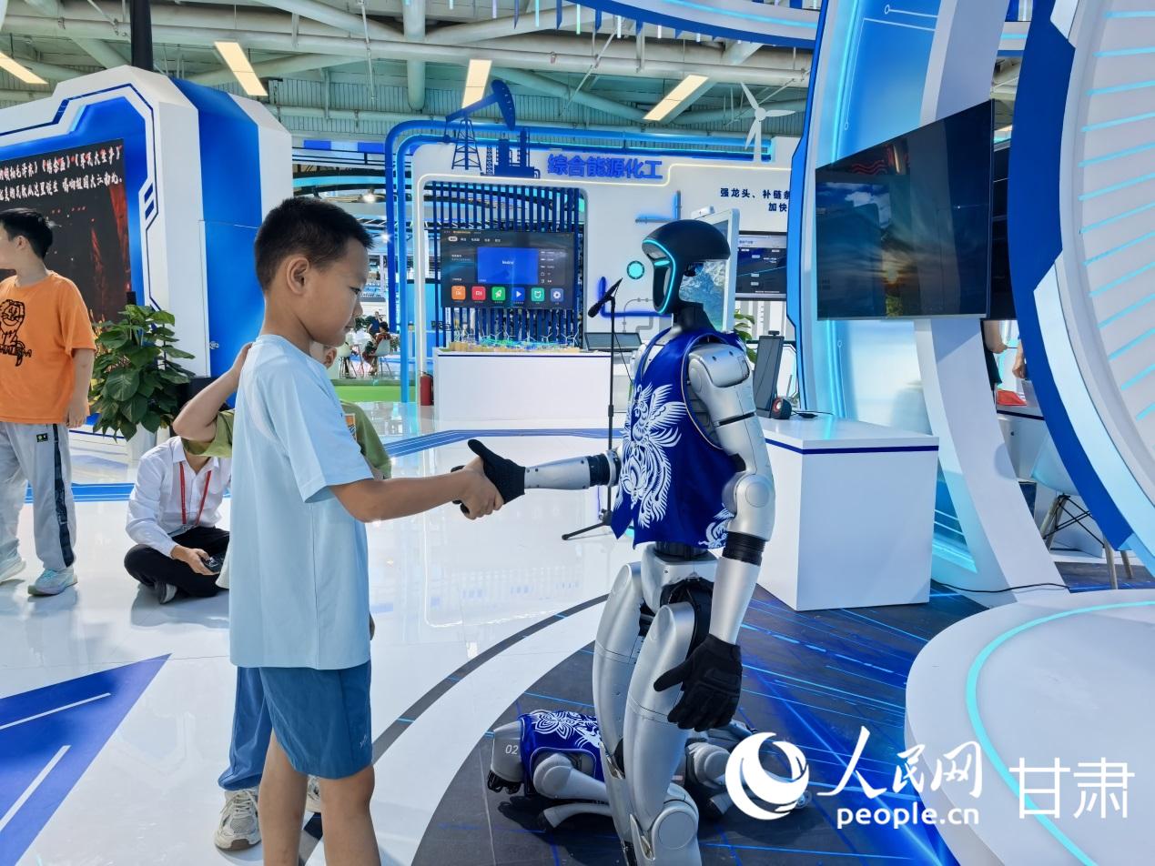 第三十一屆蘭洽會(huì)慶陽展館內(nèi),身著非遺剪紙服飾的機(jī)器人正與小朋友握手。人民網(wǎng)記者 高翔攝