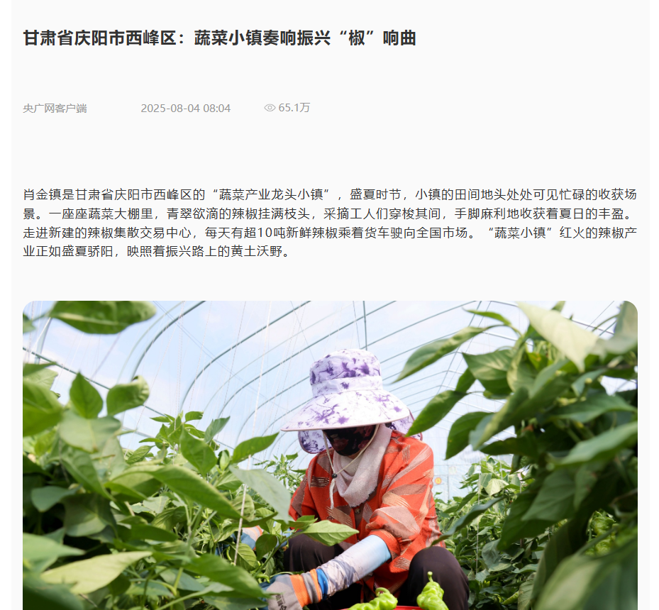 8月4日,“央廣網(wǎng)”客戶端發(fā)布《甘肅省慶陽市西峰區(qū):蔬菜小鎮(zhèn)奏響振興“椒”響曲》。