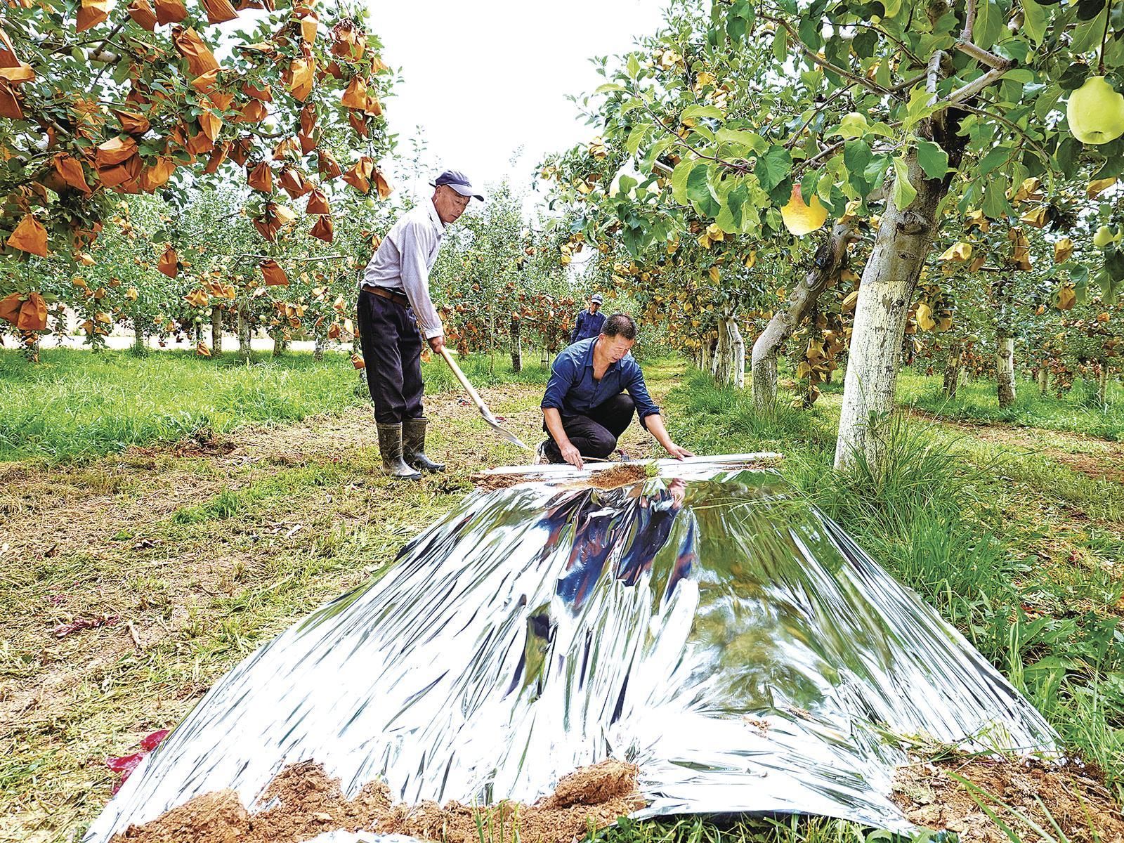 走進(jìn)后官寨鎮(zhèn)溝畎村的慶陽(yáng)春滿園種植養(yǎng)殖農(nóng)民專業(yè)合作社的果園,碩大的蘋果掛滿枝頭。果農(nóng)們手法嫻熟,小心翼翼地為蘋果褪去果袋。一旁的工人們彎著腰,細(xì)致地鋪設(shè)反光膜。“這幾天,我們投入了20多名工人,主要任務(wù)就是摘袋和鋪膜?!焙献魃绻ぷ魅藛T田希社介紹,反光膜可以有效反射陽(yáng)光,確保蘋果全方位均勻受光,顯著提升果品的著色度和糖分積累,從而增加果品價(jià)值。